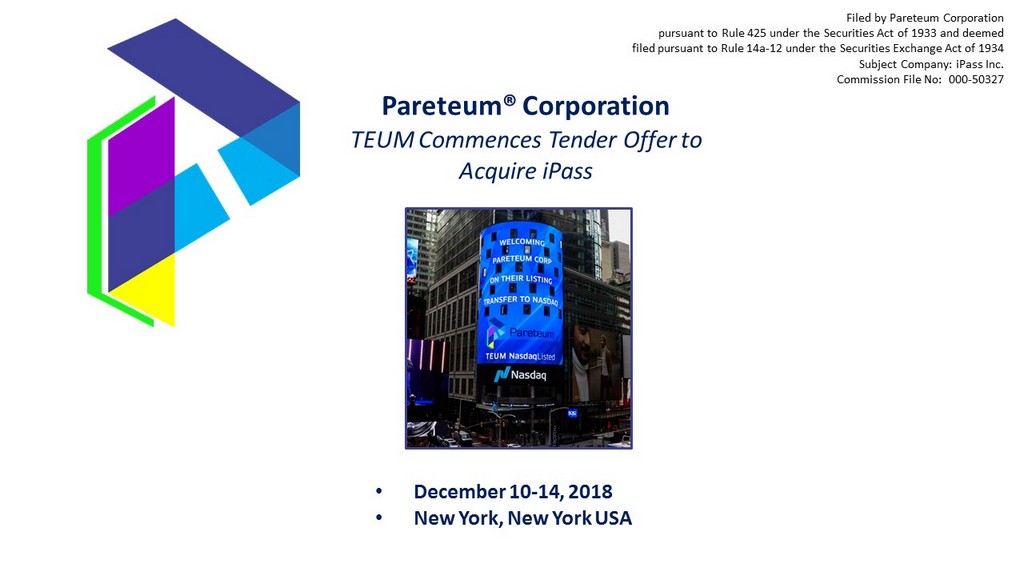 Pareteum® Corporation TEUM Commences Tender Offer to Acquire iPass Filed by Pareteum Corporation pursuant to Rule 425 under the Securities Act of 1933 and deemed filed pursuant to Rule 14a - 12 under the Securities Exchange Act of 1934 Subject Company: iPass Inc. Commission File No: 000 - 50327 • December 10 - 14, 2018 • New York, New York USA