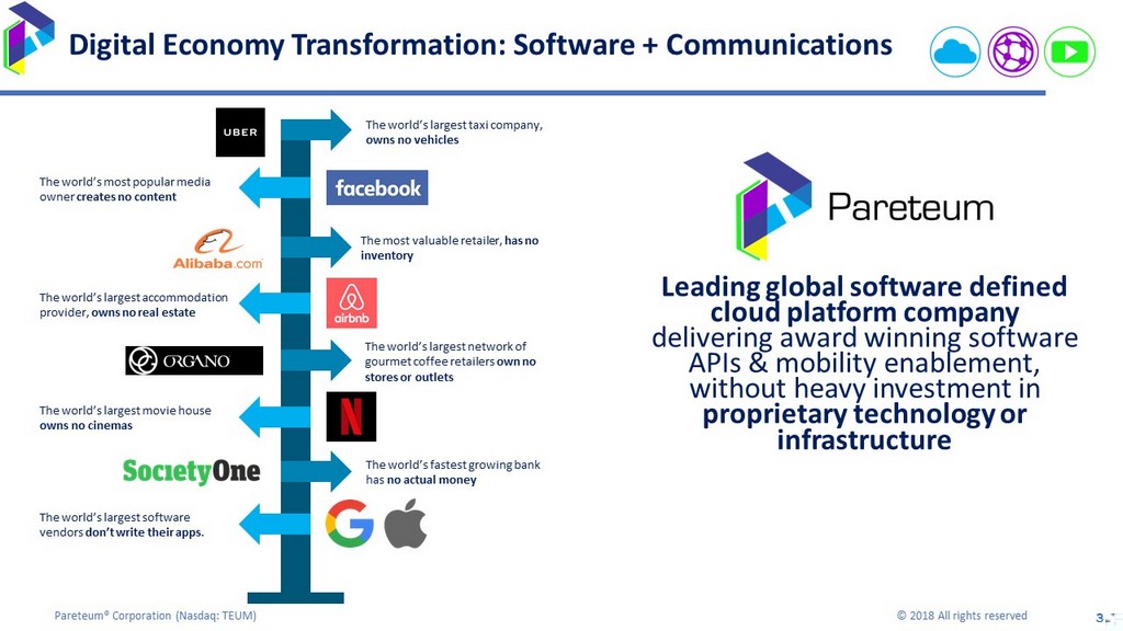 3 Pareteum® Corporation ( Nasdaq: TEUM) © 2018 All rights reserved 3 Leading global software defined cloud platform company delivering award winning software APIs & mobility enablement, without heavy investment in proprietary technology or infrastructure Digital Economy Transformation: Software + Communications The world’s largest taxi company, owns no vehicles The world’s most popular media owner creates no content The most valuable retailer, has no inventory The world’s largest accommodation provider, owns no real estate The world’s largest network of gourmet coffee retailers own no stores or outlets The world’s largest movie house owns no cinemas The world’s fastest growing bank has no actual money The world’s largest software vendors don’t write their apps .