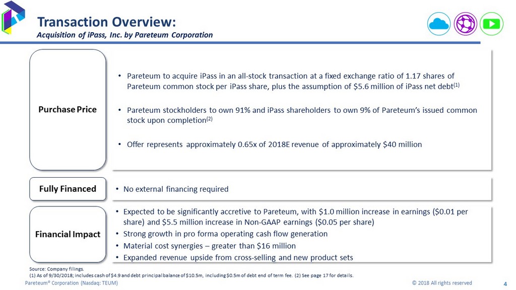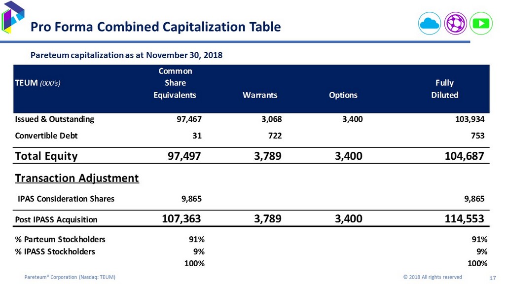 17 Pareteum® Corporation ( Nasdaq: TEUM) © 2018 All rights reserved Pro Forma Combined Capitalization Table Pareteum capitalization as at November 30, 2018 Common TEUM (000's) Share Fully Equivalents Warrants Options Diluted Issued & Outstanding 97,467 3,068 3,400 103,934 Convertible Debt 31 722 753 Total Equity 97,497 3,789 3,400 104,687 Transaction Adjustment IPAS Consideration Shares 9,865 9,865 Post IPASS Acquisition 107,363 3,789 3,400 114,553 % Parteum Stockholders 91% 91% % IPASS Stockholders 9% 9% 100% 100%