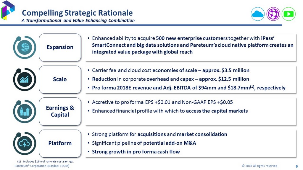 5 Pareteum® Corporation ( Nasdaq: TEUM) © 2018 All rights reserved 5 Transaction Overview (Continued) Acquisition of iPass, Inc. by Pareteum Corporation Management Implementation, Approvals & Closing • Pareteum Management and Board remains 100% intact • Certain key personnel of iPass have been identified and will be retained • Acquisition to be implemented via an exchange offer to iPass shareholders • Tender offer to commence December 4 • Customary conditions and consents required • Closing targeted for early Q1 2019 Exchange Listing • Pareteum will maintain its Nasdaq listing under the symbol TEUM • iPass will be delisted from Nasdaq Uniting Two Leading Cloud Technology Companies