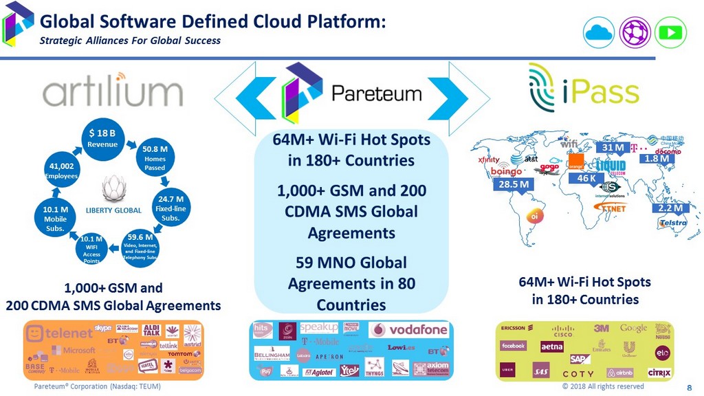 7 Pareteum® Corporation ( Nasdaq: TEUM) © 2018 All rights reserved 7 Connections 10,400,000 6,000,000 4,400,000 2018E Revenue $92.0m $40.0m $52.0m 2018E PF Adj. EBITDA $18.7m $5.5m (incl. synergies) (2) $13.2m (1) Product Overview 68M+ Wi - Fi Hot Spots in 180+ Countries 1,000+ GSM and 200 CDMA SMS Global Agreements 59 MNO Global Agreements in 80 Countries Leading global software defined cloud company Managed Services Platform Global Software Defined Cloud SuperAPI x MVNE x MVNO x CSP x CSP x Enterprise x Channels x MVNE x MVNO x CSP Leading mobile connectivity & data intelligence company Intelligent Connection Management High Value Location Data Mobile Connectivity Big Data x MNO x MVNO x CSP x CSP x Enterprise x MNO x Enterprise x Retail x Channels Source: Company filings. (1) Assumes annualized synergies of $4.3m from Artilium acquisition. (2) Assumes $16m of synergies; iPass standalone EBITDA o f ( $10.5m). v3.0 Uniting Two Leading Cloud Technology Companies
