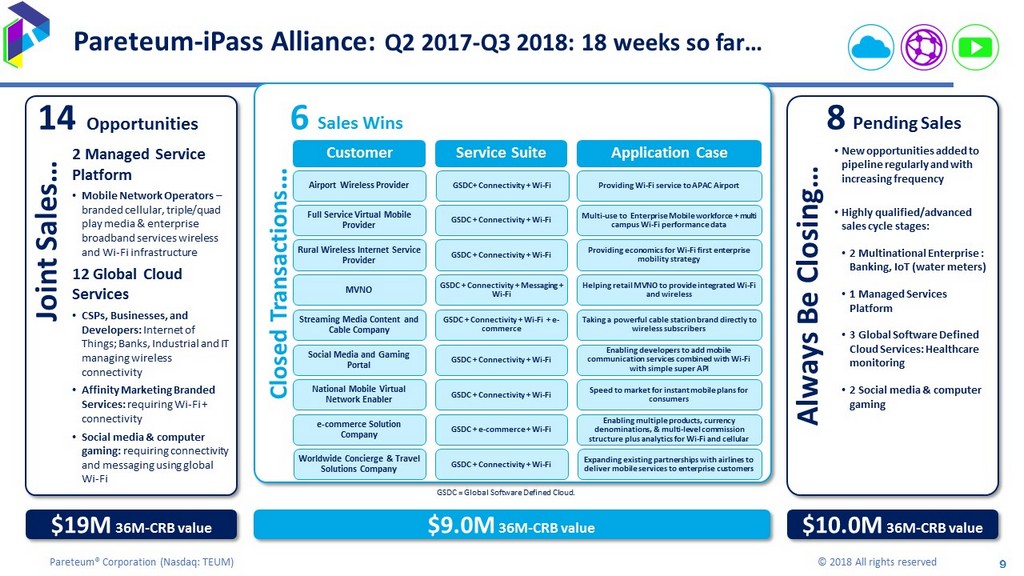 9 Pareteum® Corporation ( Nasdaq: TEUM) © 2018 All rights reserved 9 Pareteum - iPass Alliance: Q2 2017 - Q3 2018: 18 weeks so far… Closed Transactions … Joint Sales… Always Be Closing… $19M 36M - CRB value $9.0M 36M - CRB value $10.0M 36M - CRB value 14 Opportunities 8 Pending Sales 6 Sales Wins Service Suite Customer Application Case GSDC+ Connectivity + Wi - Fi Airport Wireless Provider Providing Wi - Fi service to APAC Airport GSDC + Connectivity + Wi - Fi Full Service Virtual Mobile Provider Multi - use to Enterprise Mobile workforce + multi campus Wi - Fi performance data GSDC + Connectivity + Wi - Fi Rural Wireless Internet Service Provider Providing economics for Wi - Fi first enterprise mobility strategy GSDC + Connectivity + Messaging + Wi - Fi MVNO Helping retail MVNO to provide integrated Wi - Fi and wireless GSDC + Connectivity + Wi - Fi + e - commerce Streaming Media Content and Cable Company Taking a powerful cable station brand directly to wireless subscribers GSDC + Connectivity + Wi - Fi Social Media and Gaming Portal Enabling developers to add mobile communication services combined with Wi - Fi with simple super API GSDC + Connectivity + Wi - Fi National Mobile Virtual Network Enabler Speed to market for instant mobile plans for consumers 2 Managed Service Platform • Mobile Network Operators – branded cellular, triple/quad play media & enterprise broadband services wireless and Wi - Fi infrastructure 12 Global Cloud Services • CSPs, Businesses, and Developers: Internet of Things; Banks, Industrial and IT managing wireless connectivity • Affinity Marketing Branded Services: requiring Wi - Fi + connectivity • Social media & computer gaming: requiring connectivity and messaging using global Wi - Fi • New opportunities added to pipeline regularly and with increasing frequency • Highly qualified/advanced sales cycle stages: • 2 Multinational Enterprise : Banking, IoT (water meters) • 1 Managed Services Platform • 3 Global Software Defined Cloud Services: Healthcare monitoring • 2 Social media & computer gaming GSDC + e - commerce + Wi - Fi e - commerce Solution Company Enabling multiple products, currency denominations, & multi - level commission structure plus analytics for Wi - Fi and cellular GSDC + Connectivity + Wi - Fi Worldwide Concierge & Travel Solutions Company Expanding existing partnerships with airlines to deliver mobile services to enterprise customers GSDC = Global Software Defined Cloud.