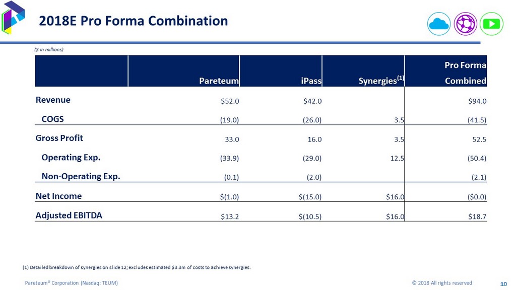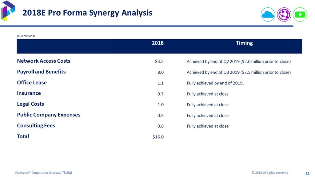 10 Pareteum® Corporation ( Nasdaq: TEUM) © 2018 All rights reserved 10 2018E Pro Forma Combination ($ in millions) Pareteum iPass Synergies (1) Pro Forma Combined Revenue $52.0 $42.0 $94.0 COGS (19.0) (26.0) 3.5 (41.5) Gross Profit 33.0 16.0 3.5 52.5 Operating Exp. (33.9) (29.0) 12.5 (50.4) Non - Operating Exp. (0.1) (2.0) (2.1) Net Income $(1.0) $(15.0) $16.0 ($0.0) Adjusted EBITDA $13.2 $(10.5) $16.0 $18.7 (1) Detailed breakdown of synergies on slide 12; excludes estimated $3.3m of costs to achieve synergies.