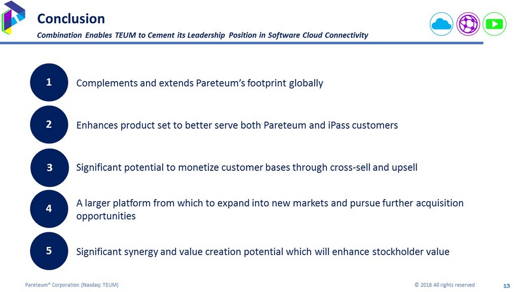 13 Pareteum® Corporation ( Nasdaq: TEUM) © 2018 All rights reserved 13 Conclusion Complements and extends Pareteum’s footprint globally Combination Enables TEUM to Cement its Leadership Position in Software Cloud Connectivity 1 Enhances product set to better serve both Pareteum and iPass customers 2 Significant potential to monetize customer bases through cross - sell and upsell 3 A larger platform from which to expand into new markets and pursue further acquisition opportunities 4 Significant synergy and value creation potential which will enhance stockholder value 5