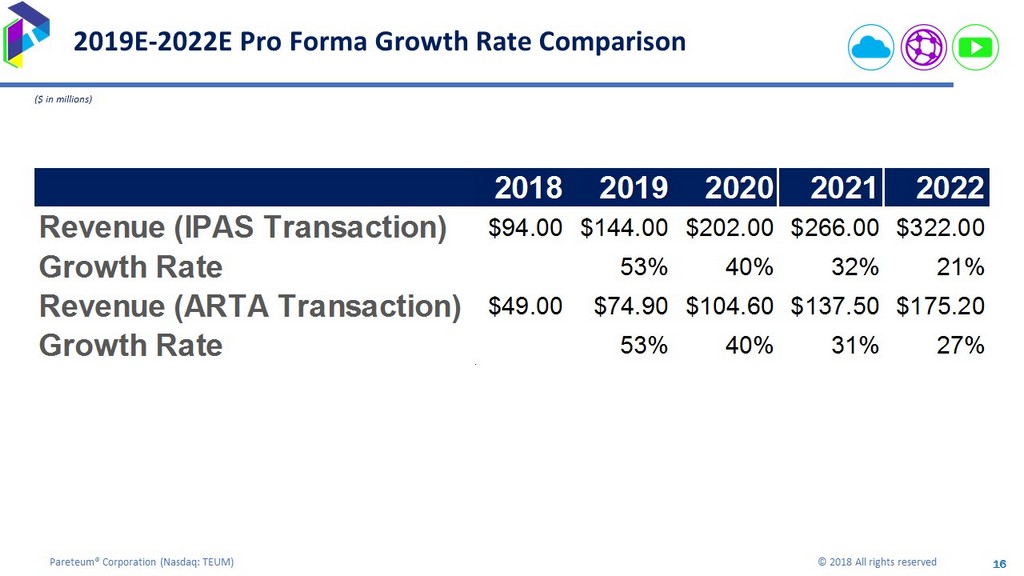 15 Pareteum® Corporation ( Nasdaq: TEUM) © 2018 All rights reserved 15 Adjusted EBITDA Reconciliation ($ in millions) 2018 2019 2020 2021 2022 Net Income $0.0 $20.0 $30.0 $40.0 $51.0 Depreciation and Amortization 6.0 4.0 4.0 4.0 4.0 Interest Expense 1.7 1.0 0.0 0.0 0.0 Taxes 0.5 3.0 10.0 22.0 40.0 Stock Based Compensation 8.5 8.0 10.0 10.0 10.0 Restructuring Expense 2.0 4.0 3.0 2.0 2.0 Adjusted EBITDA $18.7 $40.0 $57.0 $78.0 $107.0