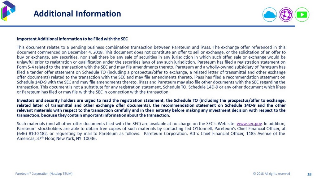 18 Pareteum® Corporation ( Nasdaq: TEUM) © 2018 All rights reserved 18 Additional Information Important Additional Information to be Filed with the SEC This document relates to a pending business combination transaction between Pareteum and iPass . The exchange offer referenced in this document commenced on December 4 , 2018 . This document does not constitute an offer to sell or exchange, or the solicitation of an offer to buy or exchange, any securities, nor shall there be any sale of securities in any jurisdiction in which such offer, sale or exchange would be unlawful prior to registration or qualification under the securities laws of any such jurisdiction . Pareteum has filed a registration statement on Form S - 4 related to the transaction with the SEC and may file amendments thereto . Pareteum and a wholly - owned subsidiary of Pareteum has filed a tender offer statement on Schedule TO (including a prospectus/offer to exchange, a related letter of transmittal and other exchange offer documents) related to the transaction with the SEC and may file amendments thereto . iPass has filed a recommendation statement on Schedule 14 D - 9 with the SEC and may file amendments thereto . iPass and Pareteum may also file other documents with the SEC regarding the transaction . This document is not a substitute for any registration statement, Schedule TO, Schedule 14 D - 9 or any other document which iPass or Pareteum has filed or may file with the SEC in connection with the transaction . Investors and security holders are urged to read the registration statement, the Schedule TO (including the prospectus/offer to exchange, related letter of transmittal and other exchange offer documents), the recommendation statement on Schedule 14 D - 9 and the other relevant materials with respect to the transaction carefully and in their entirety before making any investment decision with respect to the transaction, because they contain important information about the transaction . Such materials (and all other offer documents filed with the SEC) are available at no charge on the SEC’s Web site : www . sec . gov . In addition, Pareteum’ stockholders are able to obtain free copies of such materials by contacting Ted O’Donnell, Pareteum’s Chief Financial Officer, at ( 646 ) 810 - 2182 , or requesting by mail to Pareteum as follows : Pareteum Corporation, Attn : Chief Financial Officer, 1185 Avenue of the Americas, 37 th Floor, New York, NY 10036 .