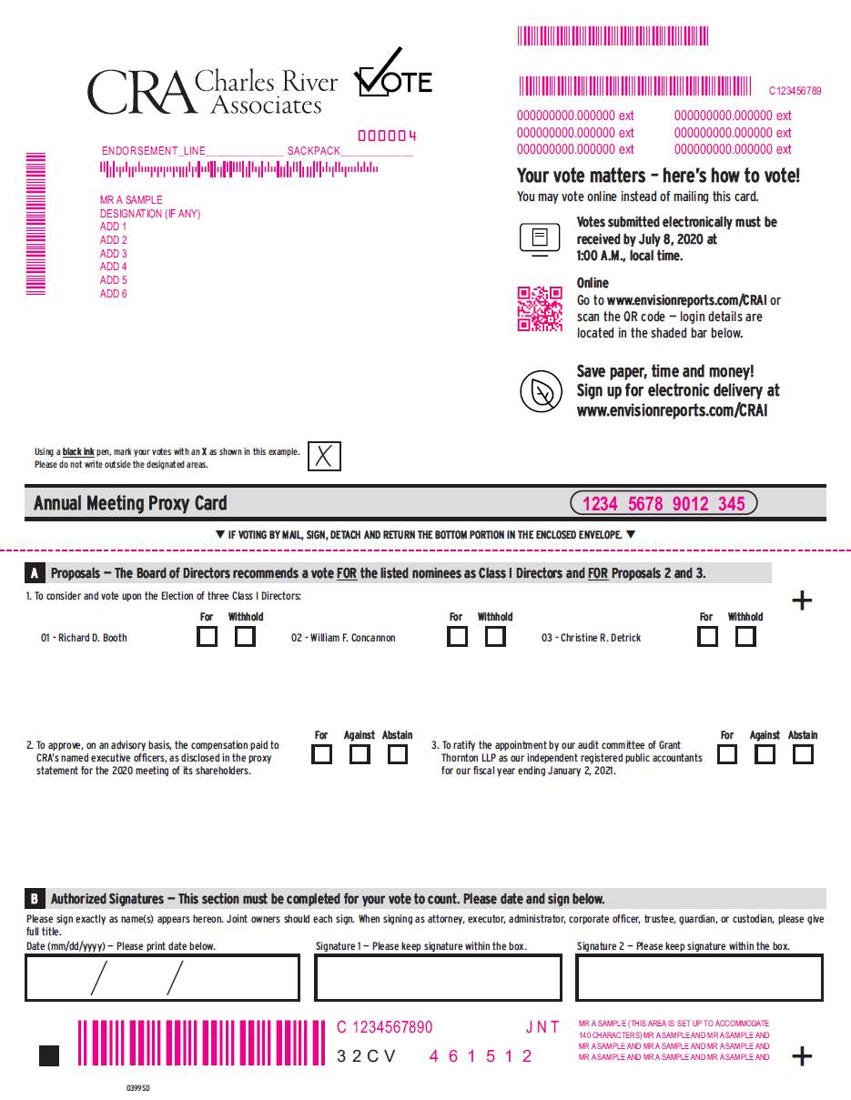 MMMMMMMMMMMM MMMMMMMMMMMMMMM C123456789 000000000.000000 ext 000000000.000000 ext 000000000.000000 ext 000000000.000000 ext 000000000.000000 ext 000000000.000000 ext 000004 ENDORSEMENT_LINE______________ SACKPACK_____________ Your vote matters – here’s how to vote! You may vote online instead of mailing this card. Votes submitted electronically must be MR A SAMPLE DESIGNATION (IF ANY) ADD 1 ADD 2 ADD 3 ADD 4 ADD 5 ADD 6 received by July 8, 2020 at 1:00 A.M., local time. Online GIof ntoo welwewct.reonnviicsivoontrienpgo, rts.com/CRAI or delete QR code and control # scan the QR code — login details are located in the shaded bar below. Save paper, time and money! Sign up for electronic delivery at www.envisionreports.com/CRAI Using a black ink pen, mark your votes with an X as shown in this example. Please do not write outside the designated areas. q IF VOTING BY MAIL, SIGN, DETACH AND RETURN THE BOTTOM PORTION IN THE ENCLOSED ENVELOPE. q + 1. To consider and vote upon the Election of three Class I Directors: For Withhold For Withhold For Withhold 01 - Richard D. Booth 02 - William F. Concannon 03 - Christine R. Detrick For Against Abstain ForAgainst Abstain 2. To approve, on an advisory basis, the compensation paid to CRA’s named executive officers, as disclosed in the proxy statement for the 2020 meeting of its shareholders. 3. To ratify the appointment by our audit committee of Grant Thornton LLP as our independent registered public accountants for our fiscal year ending January 2, 2021. Please sign exactly as name(s) appears hereon. Joint owners should each sign. When signing as attorney, executor, administrator, corporate officer, trustee, guardian, or custodian, please give full title. Date (mm/dd/yyyy) — Please print date below. Signature 1 — Please keep signature within the box. Signature 2 — Please keep signature within the box. MMMMMMM C 1234567890 J N T 6 1 5 1 2 MR A SAMPLE (THIS AREA IS SET UP TO ACCOMMODATE 140 CHARACTERS) MR A SAMPLE AND MR A SAMPLE AND MR A SAMPLE AND MR A SAMPLE AND MR A SAMPLE AND MR A SAMPLE AND MR A SAMPLE AND MR A SAMPLE AND + 3 2 C V 4 0399SD MMMMMMMMM B Authorized Signatures — This section must be completed for your vote to count. Please date and sign below. A Proposals — The Board of Directors recommends a vote FOR the listed nominees as Class I Directors and FOR Proposals 2 and 3. Annual Meeting Proxy Card1234 5678 9012 345