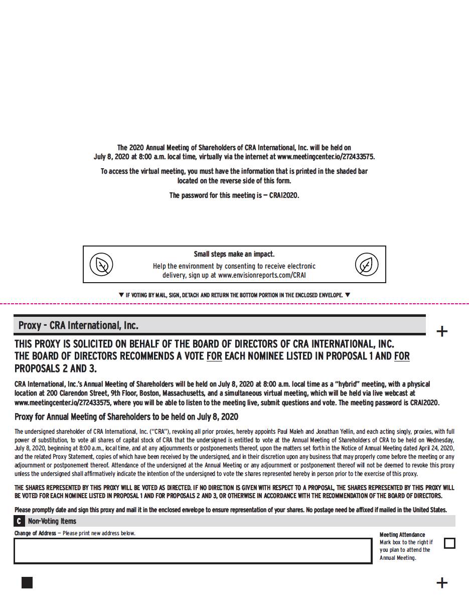 The 2020 Annual Meeting of Shareholders of CRA International, Inc. will be held on July 8, 2020 at 8:00 a.m. local time, virtually via the internet at www.meetingcenter.io/272433575. To access the virtual meeting, you must have the information that is printed in the shaded bar located on the reverse side of this form. The password for this meeting is — CRAI2020. q IF VOTING BY MAIL, SIGN, DETACH AND RETURN THE BOTTOM PORTION IN THE ENCLOSED ENVELOPE. q + THIS PROXY IS SOLICITED ON BEHALF OF THE BOARD OF DIRECTORS OF CRA INTERNATIONAL, INC. THE BOARD OF DIRECTORS RECOMMENDS A VOTE FOR EACH NOMINEE LISTED IN PROPOSAL 1 AND FOR PROPOSALS 2 AND 3. CRA International, Inc.’s Annual Meeting of Shareholders will be held on July 8, 2020 at 8:00 a.m. local time as a “hybrid” meeting, with a physical location at 200 Clarendon Street, 9th Floor, Boston, Massachusetts, and a simultaneous virtual meeting, which will be held via live webcast at www.meetingcenter.io/272433575, where you will be able to listen to the meeting live, submit questions and vote. The meeting password is CRAI2020. Proxy for Annual Meeting of Shareholders to be held on July 8, 2020 The undersigned shareholder of CRA International, Inc. (“CRA”), revoking all prior proxies, hereby appoints Paul Maleh and Jonathan Yellin, and each acting singly, proxies, with full power of substitution, to vote all shares of capital stock of CRA that the undersigned is entitled to vote at the Annual Meeting of Shareholders of CRA to be held on Wednesday, July 8, 2020, beginning at 8:00 a.m., local time, and at any adjournments or postponements thereof, upon the matters set forth in the Notice of Annual Meeting dated April 24, 2020, and the related Proxy Statement, copies of which have been received by the undersigned, and in their discretion upon any business that may properly come before the meeting or any adjournment or postponement thereof. Attendance of the undersigned at the Annual Meeting or any adjournment or postponement thereof will not be deemed to revoke this proxy unless the undersigned shall affirmatively indicate the intention of the undersigned to vote the shares represented hereby in person prior to the exercise of this proxy. THE SHARES REPRESENTED BY THIS PROXY WILL BE VOTED AS DIRECTED. IF NO DIRECTION IS GIVEN WITH RESPECT TO A PROPOSAL, THE SHARES REPRESENTED BY THIS PROXY WILL BE VOTED FOR EACH NOMINEE LISTED IN PROPOSAL 1 AND FOR PROPOSALS 2 AND 3, OR OTHERWISE IN ACCORDANCE WITH THE RECOMMENDATION OF THE BOARD OF DIRECTORS. Please promptly date and sign this proxy and mail it in the enclosed envelope to ensure representation of your shares. No postage need be affixed if mailed in the United States. Change of Address — Please print new address below. Meeting Attendance Mark box to the right if you plan to attend the Annual Meeting. + C Non-Voting Items Proxy - CRA International, Inc. Small steps make an impact. Help the environment by consenting to receive electronic delivery, sign up at www.envisionreports.com/CRAI