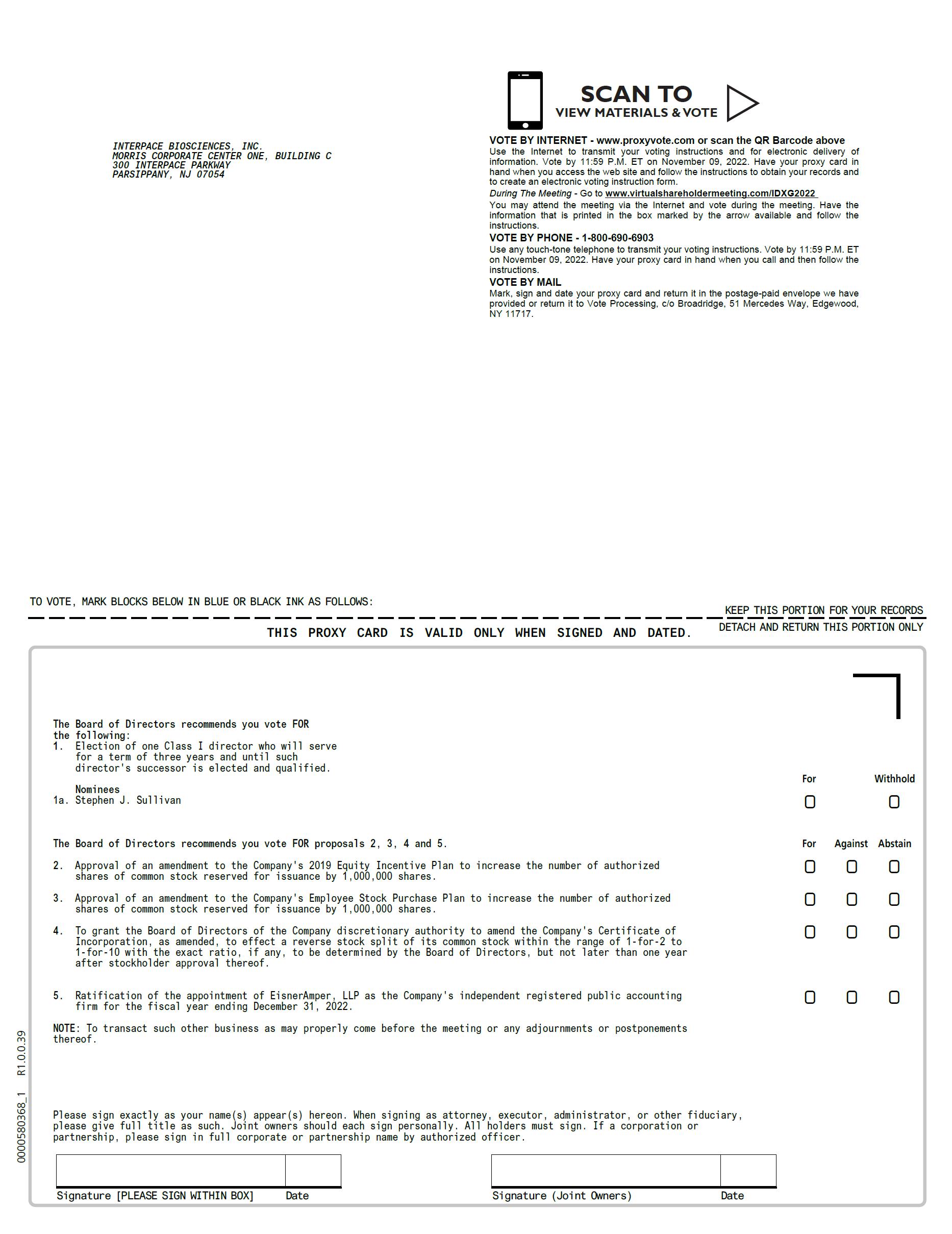 We have decided that the Annual Meeting will be held in a virtual format only, via the Internet, with no physical in-person meeting. We are pleased to use the latest technology to increase access, to improve communication and to obtain cost savings for our stockholders and the Company. Use of a virtual meeting will enable increased stockholder attendance and participation as stockholders can participate from any location. Stockholders will have the ability to attend, vote and submit questions shortly before and during the virtual meeting from any location via the Internet at www.virtualshareholdermeeting.com/IDXG2022. If you intend to participate in the virtual meeting, please refer to the section “General Information About the Annual Meeting and Voting” below.