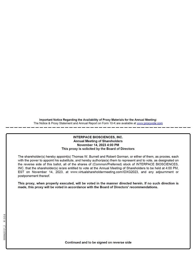 It is my pleasure to invite you to attend Interpace Biosciences, Inc.’s (“Interpace”, the “Company”, “we”, “us” or “our”) Annual Meeting of Stockholders to be held on November 14, 2023, at 4:00 p.m., Eastern Time (the “Annual Meeting”).