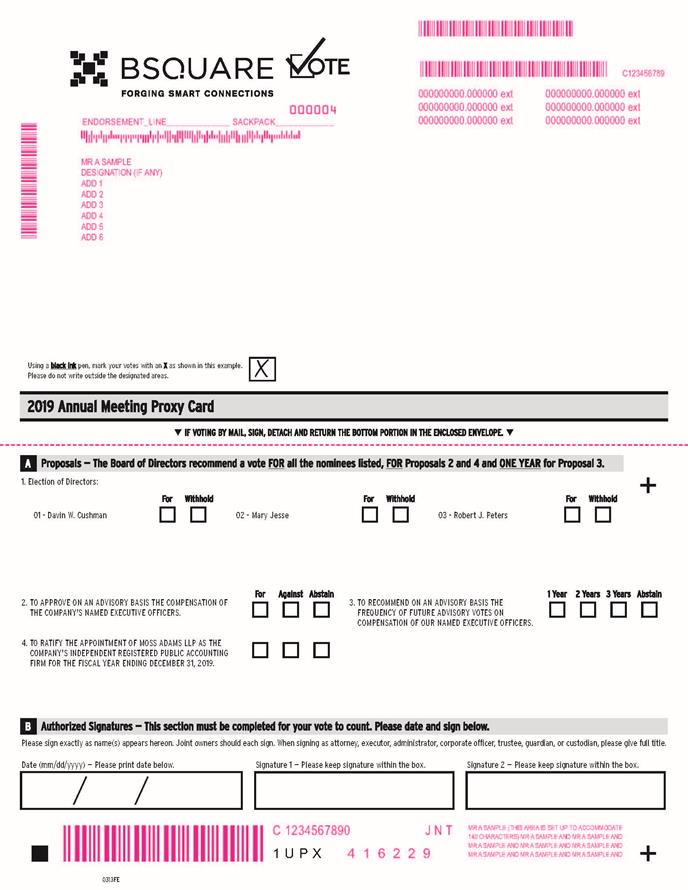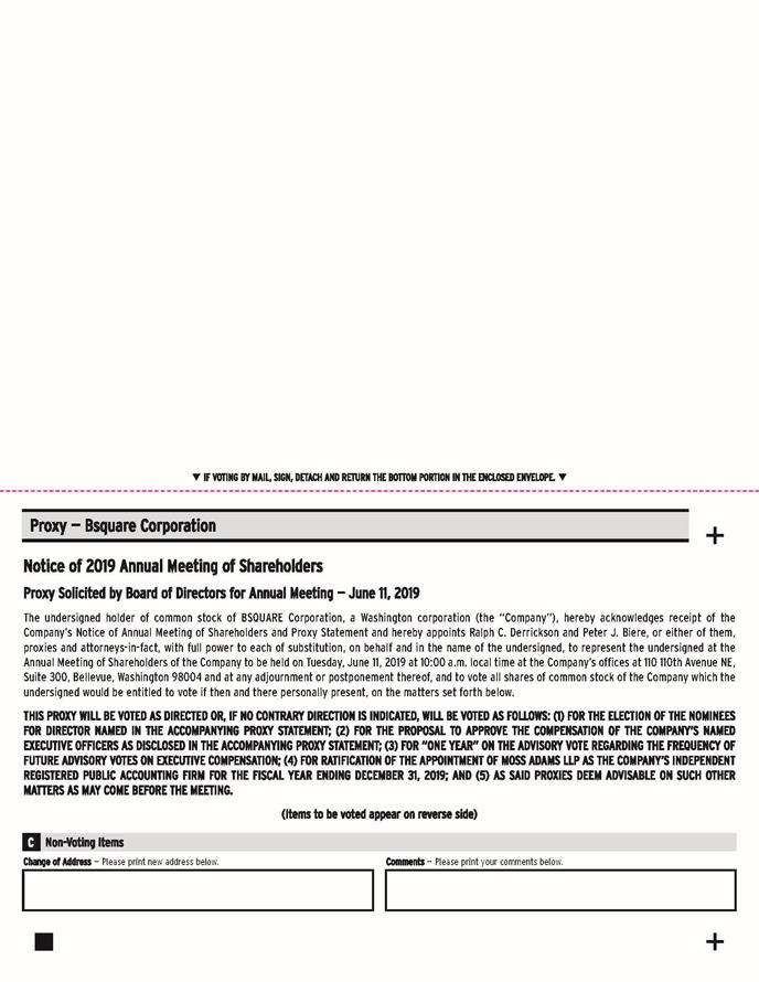 MMMMMMMMMMMM MMMMMMMMMMMMMMM C123456789 000000000.000000 ext 000000000.000000 ext 000000000.000000 ext 000000000.000000 ext 000004 ENDORSEMENT_LINE______________ SACKPACK_____________ 000000000.000000 ext 000000000.000000 ext MMMMMMMMM MR ASAMPLE DESIGNATION (IF ANY) ADD 1 ADD 2 ADD 3 ADD 4 ADD 5 ADD 6 Using a black ink pen, mark your votes with an X as shown in this example. Please do not write outside the designated areas. 2019 Annual Meeting Proxy Card IF VOTING BY MAIL, SIGN, DETACH AND RETURN THE BOTTOM PORTION IN THE ENCLOSED ENVELOPE. Proposals — The Board of Directors recommend a vote FOR all the nominees listed, FOR Proposals 2 and 4 and ONE YEAR for Proposal 3. 1. Election of Directors: + For Withhold For Withhold For Withhold 01 - Davin W. Cushman 02 - Mary Jesse 03 - Robert J. Peters For Against Abstain 1 Year 2 Years 3 Years Abstain 2. TO APPROVE ON AN ADVISORY BASIS THE COMPENSATION OF 3. TO RECOMMEND ON AN ADVISORY BASIS THE THE COMPANY'S NAMED EXECUTIVE OFFICERS. FREQUENCY OF FUTURE ADVISORY VOTES ON COMPENSATION OF OUR NAMED EXECUTIVE OFFICERS. 4. TO RATIFY THE APPOINTMENT OF MOSS ADAMS LLP AS THE COMPANY'S INDEPENDENT REGISTERED PUBLIC ACCOUNTING FIRM FOR THE FISCAL YEAR ENDING DECEMBER 31, 2019. Please sign exactly as name(s) appears hereon. Joint owners should each sign. When signing as attorney, executor, administrator, corporate officer, trustee, guardian, or custodian, please give full title. Date (mm/dd/yyyy) — Please print date below. Signature 1 — Please keep signature within the box. Signature 2 — Please keep signature within the box. MR A SAMPLE (THIS AREA IS SET UPTOACCOMMODATE C 1234567890 JNT 140 CHARACTERS) MR A SAMPLE AND MR A SAMPLE AND MR ASAMPLE AND MR ASAMPLE AND MR ASAMPLE AND 1UPX 416229 MR ASAMPLE AND MR ASAMPLE AND MR ASAMPLE AND MMMMMMM + 0313FE IF VOTING BY MAIL, SIGN, DETACH AND RETURN THE BOTTOM PORTION IN THE ENCLOSED ENVELOPE. Proxy — Bsquare Corporation + Notice of 2019 Annual Meeting of Shareholders Proxy Solicited by Board of Directors for Annual Meeting — June 11, 2019 The undersigned holder of common stock of BSQUARE Corporation, a Washington corporation (the “Company”), hereby acknowledges receipt of the Company’s Notice of Annual Meeting of Shareholders and Proxy Statement and hereby appoints Ralph C. Derrickson and Peter J. Biere, or either of them, proxies and attorneys-in-fact, with full power to each of substitution, on behalf and in the name of the undersigned, to represent the undersigned at the Annual Meeting of Shareholders of the Company to be held on Tuesday, June 11, 2019 at 10:00 a.m. local time at the Company’s offices at 110 110th Avenue NE, Suite 300, Bellevue, Washington 98004 and at any adjournment or postponement thereof, and to vote all shares of common stock of the Company which the undersigned would be entitled to vote if then and there personally present, on the matters set forth below. THIS PROXY WILL BE VOTED AS DIRECTED OR, IF NO CONTRARY DIRECTION IS INDICATED, WILL BE VOTED AS FOLLOWS: (1) FOR THE ELECTION OF THE NOMINEES FOR DIRECTOR NAMED IN THE ACCOMPANYING PROXY STATEMENT; (2) FOR THE PROPOSAL TO APPROVE THE COMPENSATION OF THE COMPANY’S NAMED EXECUTIVE OFFICERS AS DISCLOSED IN THE ACCOMPANYING PROXY STATEMENT; (3) FOR “ONE YEAR” ON THE ADVISORY VOTE REGARDING THE FREQUENCY OF FUTURE ADVISORY VOTES ON EXECUTIVE COMPENSATION; (4) FOR RATIFICATION OF THE APPOINTMENT OF MOSS ADAMS LLP AS THE COMPANY’S INDEPENDENT REGISTERED PUBLIC ACCOUNTING FIRM FOR THE FISCAL YEAR ENDING DECEMBER 31, 2019; AND (5) AS SAID PROXIES DEEM ADVISABLE ON SUCH OTHER MATTERS AS MAY COME BEFORE THE MEETING. (Items to be voted appear on reverse side) Change of Address — Please print new address below. Comments — Please print your comments below. +