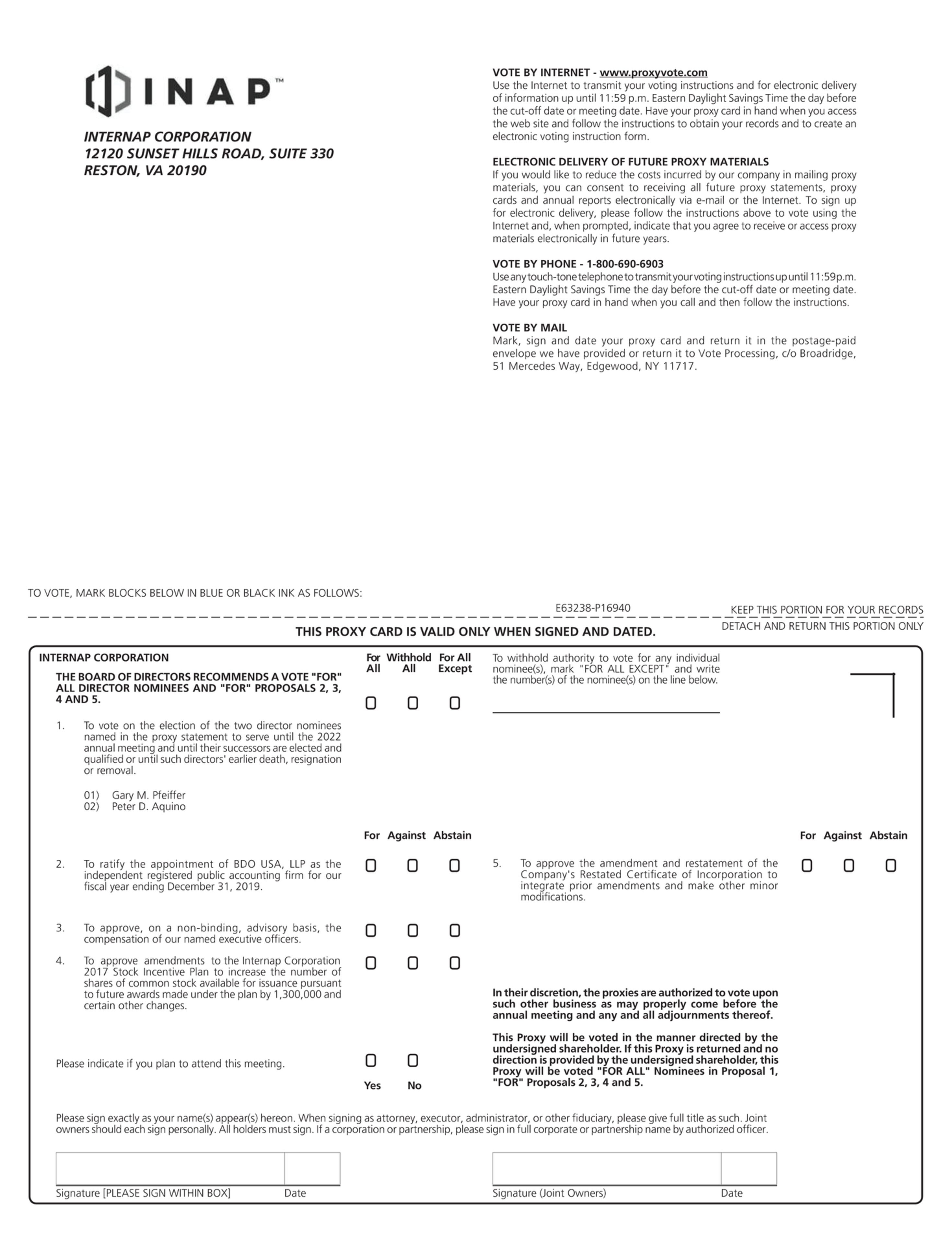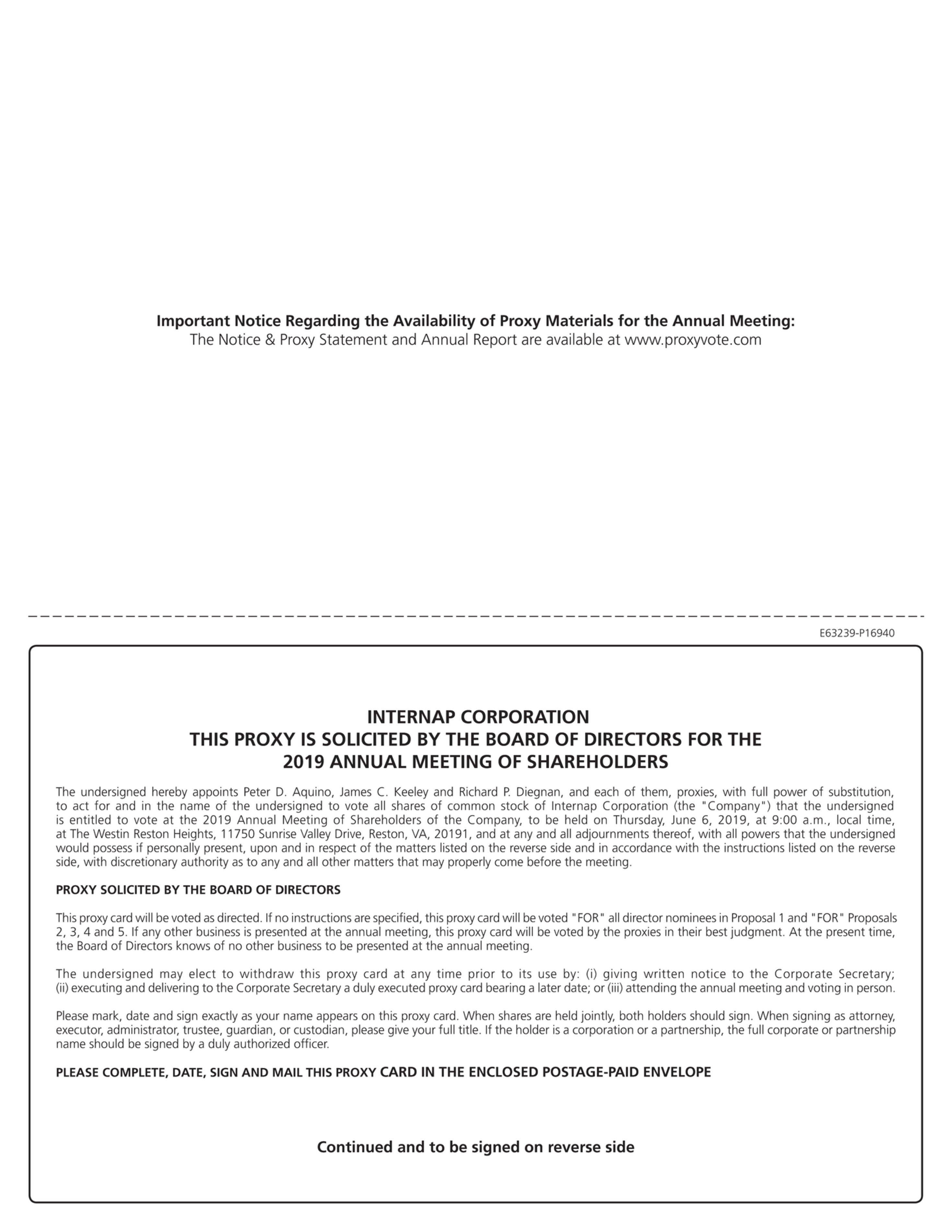 We invite you to attend Internap Corporation’s 2019 Annual Meeting of Shareholders at The Westin Reston Heights, 11750 Sunrise Valley Drive, Reston, VA 20191, on Thursday, June 6, 2019, at 9:00 a.m. local time. At the meeting, shareholders will be asked to vote upon the following proposals:
