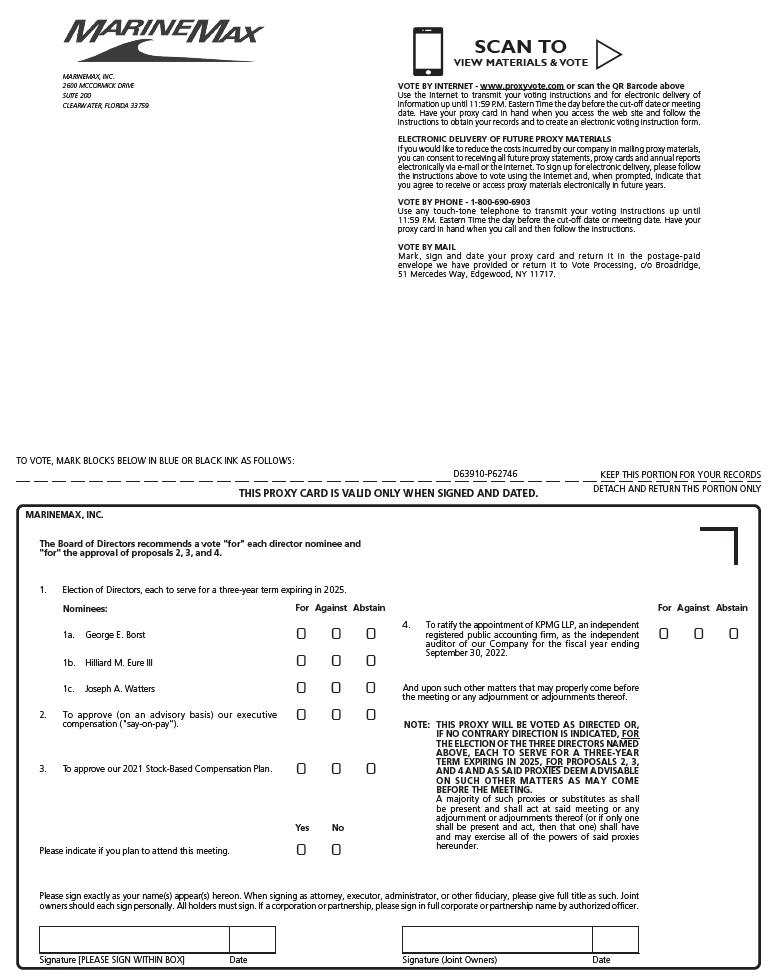 MARINEMAX MARINEMAX, INC. 2600 MCCORMICK DRIVE SUITE 200 CLEARWATER, FLORIDA 33759 SCAN TO VIEW MATERIALS & VOTE VOTE BY INTERNET - www.proxyvote.com or scan the QR Barcode above Use the Internet to transmit your voting instructions and for electronic delivery of information up until 11:59 P.M. Eastern Time the day before the cut-off date or meeting date. Have your proxy card in hand when you access the web site and follow the instructions to obtain your records and to create an electronic voting instruction form. ELECTRONIC DELIVERY OF FUTURE PROXY MATERIALS If you would like to reduce the costs incurred by our company in mailing proxy materials, you can consent to receiving all future proxy statements, proxy cards and annual reports electronically via e-mail or the Internet. To sign up for electronic delivery, please follow the instructions above to vote using the Internet and, when prompted, indicate that you agree to receive or access proxy materials electronically in future years. VOTE BY PHONE - 1-800-690-6903 Use any touch-tone telephone to transmit your voting instructions up until 11:59 P.M. Eastern Time the day before the cut-off date or meeting date. Have your proxy card in hand when you call and then follow the instructions. VOTE BY MAIL Mark, sign and date your proxy card and return it in the postage-paid envelope we have provided or return it to Vote Processing, c/o Broadridge, 51 Mercedes Way, Edgewood, NY 11717. TO VOTE, MARK BLOCKS BELOW IN BLUE OR BLACK INK AS FOLLOWS: KEEP THIS PORTION FOR YOUR RECORDS D63910-P62746 THIS PROXY CARD IS VALID ONLY WHEN SIGNED AND DATED. DETACH AND RETURN THIS PORTION ONLY MARINEMAX, INC. The Board of Directors recommends a vote "for" each director nominee and "for" the approval of proposals 2, 3, and 4. 1. Election of Directors, each to serve for a three-year term expiring in 2025. Nominees: 1a. George E. Borst 1b. Hilliard M. Eure III 1c. Joseph A. Watters 2. To approve (on an advisory basis) our executive compensation ("say-on-pay"). 3. To approve our 2021 Stock-Based Compensation Plan. Abstain Against For Please indicate if you plan to attend this meeting. Yes No For Against Abstain 4. To ratify the appointment of KPMG LLP, an independent registered public accounting firm, as the independent auditor of our Company for the fiscal year ending September 30, 2022. NOTE: THIS PROXY WILL BE VOTED AS DIRECTED OR, IF NO CONTRARY DIRECTION IS INDICATED, FOR THE ELECTION OF THE THREE DIRECTORS NAMED ABOVE, EACH TO SERVE FOR A THREE-YEAR TERM EXPIRING IN 2025, FOR PROPOSALS 2, 3, AND 4 AND AS SAID PROXIES DEEM ADVISABLE ON SUCH OTHER MATTERS AS MAY COME BEFORE THE MEETING. A majority of such proxies or substitutes as shall be present and shall act at said meeting or any adjournment or adjournments thereof (or if only one shall be present and act, then that one) shall have and may exercise all of the powers of said proxies hereunder. And upon such other matters that may properly come before the meeting or any adjournment or adjournments thereof. Please sign exactly as your name(s) appear(s) hereon. When signing as attorney, executor, administrator, or other fiduciary, please give full title as such. Joint owners should each sign personally. All holders must sign. If a corporation or partnership, please sign in full corporate or partnership name by authorized officer. Signature [PLEASE SIGN WITHIN BOX] Date Signature (Joint Owners) Date