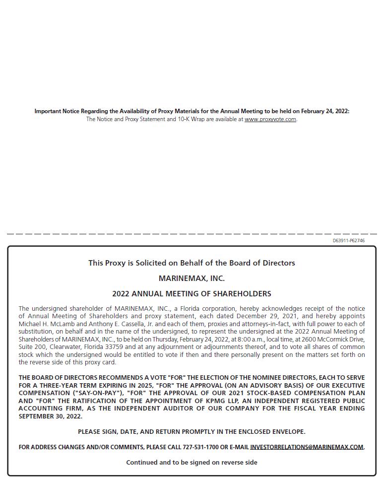 Important Notice Regarding the Availability of Proxy Materials for the Annual Meeting to be held on February 24, 2022: The Notice and Proxy Statement and 10-K Wrap are available at www.proxyvote.com. D63911-P62746 This Proxy is Solicited on Behalf of the Board of Directors MARINEMAX, INC. 2022 ANNUAL MEETING OF SHAREHOLDERS The undersigned shareholder of MARINEMAX, INC., a Florida corporation, hereby acknowledges receipt of the notice of Annual Meeting of Shareholders and proxy statement, each dated December 29, 2021, and hereby appointsMichael H. McLamb and Anthony E. Cassella, Jr. and each of them, proxies and attorneys-in-fact, with full power to each of substitution, on behalf and in the name of the undersigned, to represent the undersigned at the 2022 Annual Meeting of Shareholders of MARINEMAX, INC., to be held on Thursday, February 24, 2022, at 8:00 a.m., local time, at 2600 McCormick Drive,Suite 200, Clearwater, Florida 33759 and at any adjournment or adjournments thereof, and to vote all shares of common stock which the undersigned would be entitled to vote if then and there personally present on the matters set forth on the reverse side of this proxy card. THE BOARD OF DIRECTORS RECOMMENDS A VOTE "FOR" THE ELECTION OF THE NOMINEE DIRECTORS, EACH TO SERVEFOR A THREE-YEAR TERM EXPIRING IN 2025, "FOR" THE APPROVAL (ON AN ADVISORY BASIS) OF OUR EXECUTIVE COMPENSATION ("SAY-ON-PAY"), "FOR" THE APPROVAL OF OUR 2021 STOCK-BASED COMPENSATION PLAN AND "FOR" THE RATIFICATION OF THE APPOINTMENT OF KPMG LLP, AN INDEPENDENT REGISTERED PUBLIC ACCOUNTING FIRM, AS THE INDEPENDENT AUDITOR OF OUR COMPANY FOR THE FISCAL YEAR ENDINGSEPTEMBER 30, 2022. PLEASE SIGN, DATE, AND RETURN PROMPTLY IN THE ENCLOSED ENVELOPE. FOR ADDRESS CHANGES AND/OR COMMENTS, PLEASE CALL 727-531-1700 OR E-MAIL INVESTORRELATIONS@MARINEMAX.COM. Continued and to be signed on reverse side