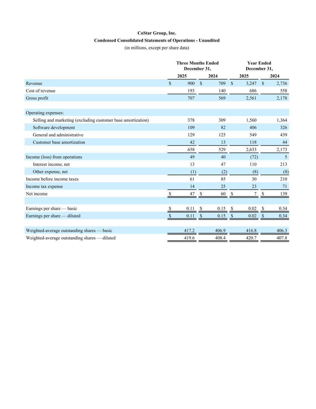 CoStar Group, Inc. Condensed Consolidated Statements of Operations - Unaudited (in millions, except per share data) Three Months Ended December 31, Year Ended December 31, 2025 2024 2025 2024 Revenue $ 900 $ 709 $ 3,247 $ 2,736 Cost of revenue 193 140 686 558 Gross profit 707 569 2,561 2,178 Operating expenses: Selling and marketing (excluding customer base amortization) 378 309 1,560 1,364 Software development 109 82 406 326 General and administrative 129 125 549 439 Customer base amortization 42 13 118 44 658 529 2,633 2,173 Income (loss) from operations 49 40 (72) 5 Interest income, net 13 47 110 213 Other expense, net (1) (2) (8) (8) Income before income taxes 61 85 30 210 Income tax expense 14 25 23 71 Net income $ 47 $ 60 $ 7 $ 139 Earnings per share — basic $ 0.11 $ 0.15 $ 0.02 $ 0.34 Earnings per share — diluted $ 0.11 $ 0.15 $ 0.02 $ 0.34 Weighted-average outstanding shares — basic 417.2 406.9 416.8 406.3 Weighted-average outstanding shares — diluted 419.6 408.4 420.7 407.8