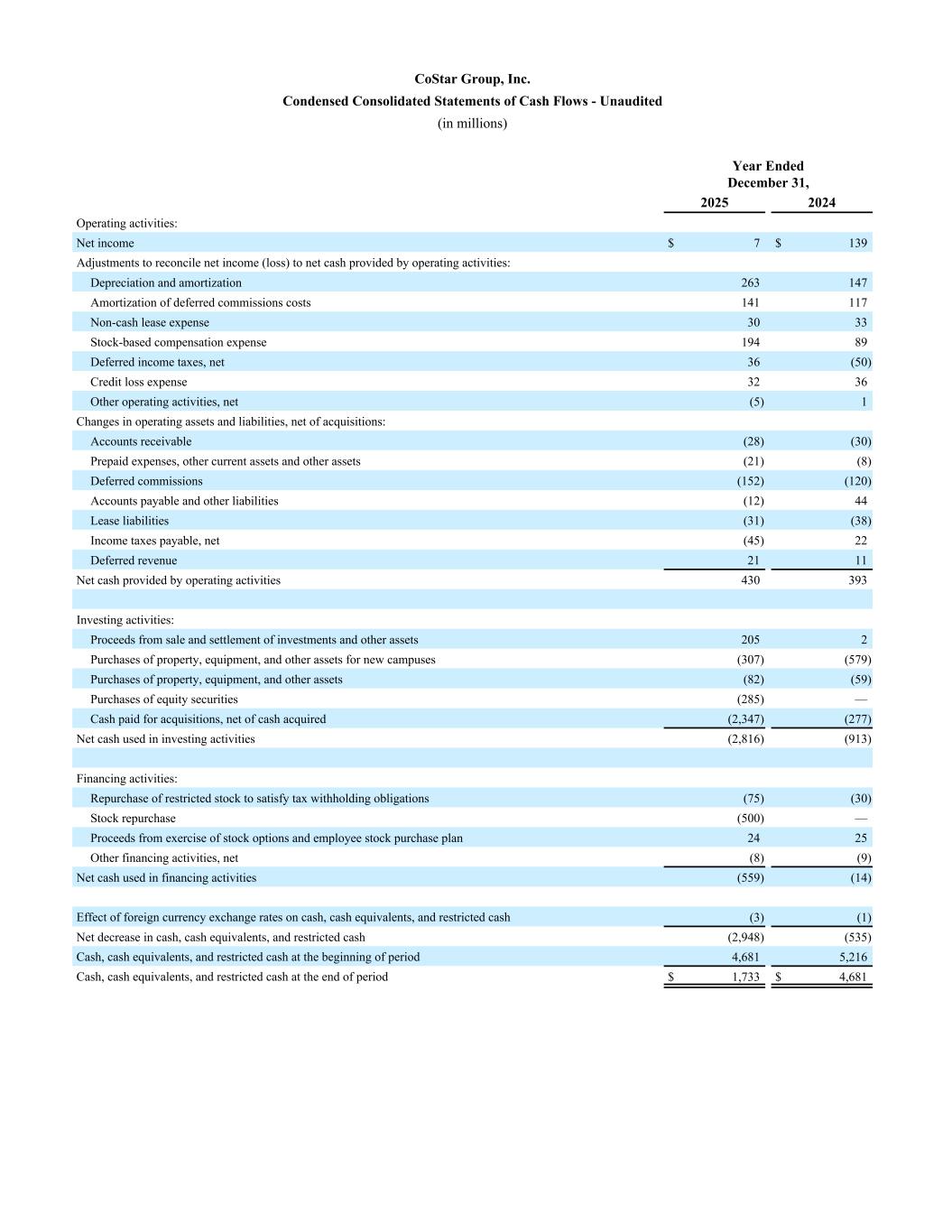 CoStar Group, Inc. Condensed Consolidated Statements of Cash Flows - Unaudited (in millions) Year Ended December 31, 2025 2024 Operating activities: Net income $ 7 $ 139 Adjustments to reconcile net income (loss) to net cash provided by operating activities: Depreciation and amortization 263 147 Amortization of deferred commissions costs 141 117 Non-cash lease expense 30 33 Stock-based compensation expense 194 89 Deferred income taxes, net 36 (50) Credit loss expense 32 36 Other operating activities, net (5) 1 Changes in operating assets and liabilities, net of acquisitions: Accounts receivable (28) (30) Prepaid expenses, other current assets and other assets (21) (8) Deferred commissions (152) (120) Accounts payable and other liabilities (12) 44 Lease liabilities (31) (38) Income taxes payable, net (45) 22 Deferred revenue 21 11 Net cash provided by operating activities 430 393 Investing activities: Proceeds from sale and settlement of investments and other assets 205 2 Purchases of property, equipment, and other assets for new campuses (307) (579) Purchases of property, equipment, and other assets (82) (59) Purchases of equity securities (285) — Cash paid for acquisitions, net of cash acquired (2,347) (277) Net cash used in investing activities (2,816) (913) Financing activities: Repurchase of restricted stock to satisfy tax withholding obligations (75) (30) Stock repurchase (500) — Proceeds from exercise of stock options and employee stock purchase plan 24 25 Other financing activities, net (8) (9) Net cash used in financing activities (559) (14) Effect of foreign currency exchange rates on cash, cash equivalents, and restricted cash (3) (1) Net decrease in cash, cash equivalents, and restricted cash (2,948) (535) Cash, cash equivalents, and restricted cash at the beginning of period 4,681 5,216 Cash, cash equivalents, and restricted cash at the end of period $ 1,733 $ 4,681