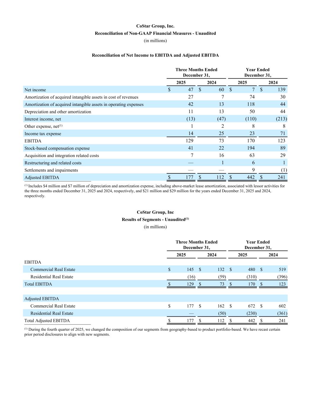 CoStar Group, Inc. Reconciliation of Non-GAAP Financial Measures - Unaudited (in millions) Reconciliation of Net Income to EBITDA and Adjusted EBITDA Three Months Ended December 31, Year Ended December 31, 2025 2024 2025 2024 Net income $ 47 $ 60 $ 7 $ 139 Amortization of acquired intangible assets in cost of revenues 27 7 74 30 Amortization of acquired intangible assets in operating expenses 42 13 118 44 Depreciation and other amortization 11 13 50 44 Interest income, net (13) (47) (110) (213) Other expense, net(1) 1 2 8 8 Income tax expense 14 25 23 71 EBITDA 129 73 170 123 Stock-based compensation expense 41 22 194 89 Acquisition and integration related costs 7 16 63 29 Restructuring and related costs — 1 6 1 Settlements and impairments — — 9 (1) Adjusted EBITDA $ 177 $ 112 $ 442 $ 241 __________________________ (1) Includes $4 million and $7 million of depreciation and amortization expense, including above-market lease amortization, associated with lessor activities for the three months ended December 31, 2025 and 2024, respectively, and $21 million and $29 million for the years ended December 31, 2025 and 2024, respectively. CoStar Group, Inc Results of Segments - Unaudited(1) (in millions) Three Months Ended December 31, Year Ended December 31, 2025 2024 2025 2024 EBITDA Commercial Real Estate $ 145 $ 132 $ 480 $ 519 Residential Real Estate (16) (59) (310) (396) Total EBITDA $ 129 $ 73 $ 170 $ 123 Adjusted EBITDA Commercial Real Estate $ 177 $ 162 $ 672 $ 602 Residential Real Estate — (50) (230) (361) Total Adjusted EBITDA $ 177 $ 112 $ 442 $ 241 __________________________ (1) During the fourth quarter of 2025, we changed the composition of our segments from geography-based to product portfolio-based. We have recast certain prior period disclosures to align with new segments.