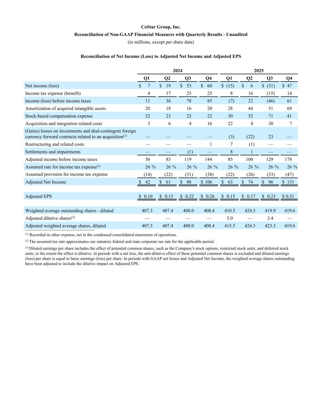 CoStar Group, Inc. Reconciliation of Non-GAAP Financial Measures with Quarterly Results - Unaudited (in millions, except per share data) Reconciliation of Net Income (Loss) to Adjusted Net Income and Adjusted EPS 2024 2025 Q1 Q2 Q3 Q4 Q1 Q2 Q3 Q4 Net income (loss) $ 7 $ 19 $ 53 $ 60 $ (15) $ 6 $ (31) $ 47 Income tax expense (benefit) 4 17 25 25 8 16 (15) 14 Income (loss) before income taxes 11 36 78 85 (7) 22 (46) 61 Amortization of acquired intangible assets 20 18 16 20 28 44 51 69 Stock-based compensation expense 22 23 22 22 30 52 71 41 Acquisition and integration related costs 3 6 4 16 22 4 30 7 (Gains) losses on investments and deal-contingent foreign currency forward contracts related to an acquisition(1) — — — — (3) (22) 23 — Restructuring and related costs — — — 1 7 (1) — — Settlements and impairments — — (1) — 8 1 — — Adjusted income before income taxes 56 83 119 144 85 100 129 178 Assumed rate for income tax expense(2) 26 % 26 % 26 % 26 % 26 % 26 % 26 % 26 % Assumed provision for income tax expense (14) (22) (31) (38) (22) (26) (33) (47) Adjusted Net Income $ 42 $ 61 $ 88 $ 106 $ 63 $ 74 $ 96 $ 131 Adjusted EPS $ 0.10 $ 0.15 $ 0.22 $ 0.26 $ 0.15 $ 0.17 $ 0.23 $ 0.31 Weighted average outstanding shares - diluted 407.3 407.4 408.0 408.4 410.5 424.3 419.9 419.6 Adjusted dilutive shares(3) — — — — 5.0 — 3.4 — Adjusted weighted average shares, diluted 407.3 407.4 408.0 408.4 415.5 424.3 423.3 419.6__________________________ (1) Recorded in other expense, net in the condensed consolidated statements of operations. (2) The assumed tax rate approximates our statutory federal and state corporate tax rate for the applicable period. (3) Diluted earnings per share includes the effect of potential common shares, such as the Company's stock options, restricted stock units, and deferred stock units, to the extent the effect is dilutive. In periods with a net loss, the anti-dilutive effect of these potential common shares is excluded and diluted earnings (loss) per share is equal to basic earnings (loss) per share. In periods with GAAP net losses and Adjusted Net Income, the weighted average shares outstanding have been adjusted to include the dilutive impact on Adjusted EPS.