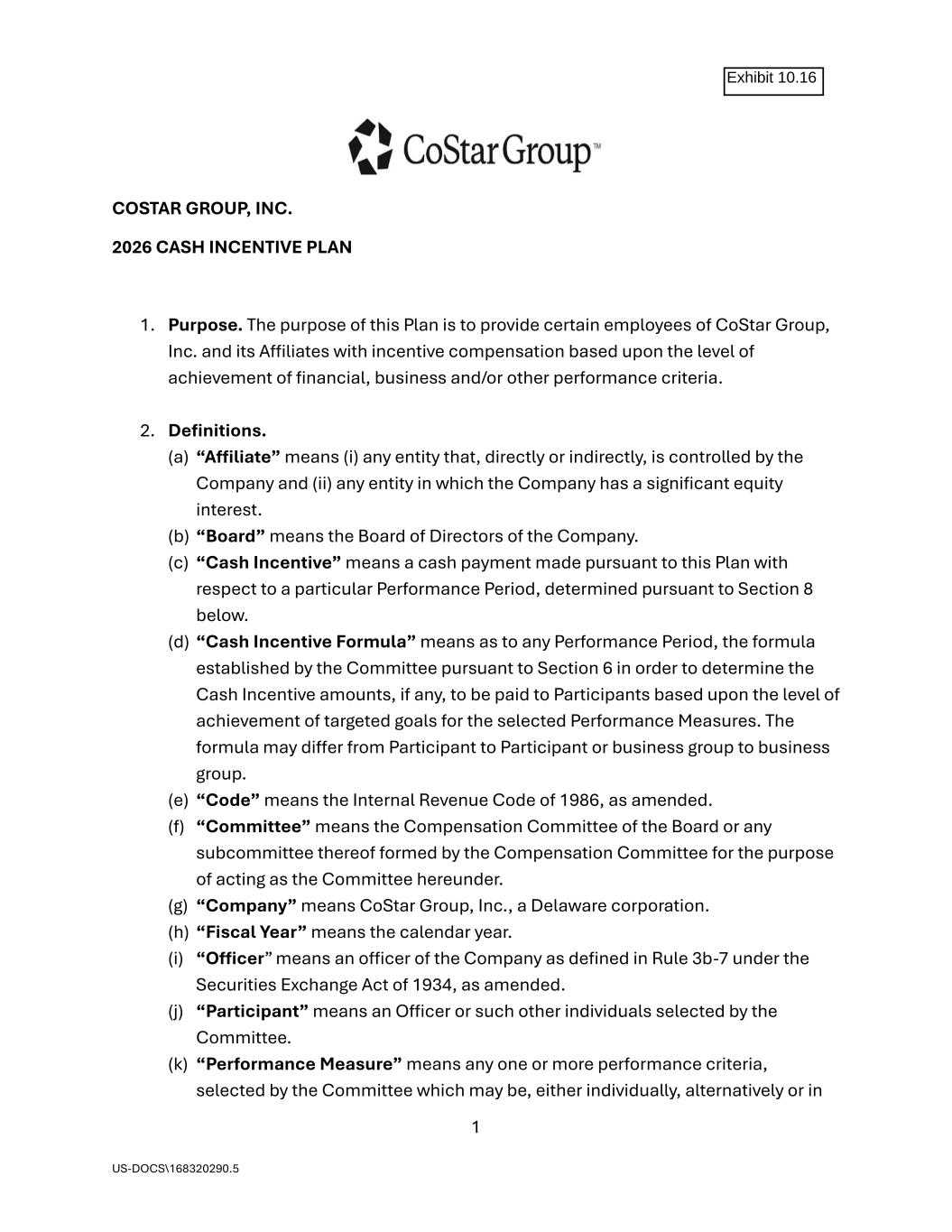 1 US-DOCS\168320290.5 COSTAR GROUP, INC. 2026 CASH INCENTIVE PLAN 1. Purpose. The purpose of this Plan is to provide certain employees of CoStar Group, Inc. and its Affiliates with incentive compensation based upon the level of achievement of financial, business and/or other performance criteria. 2. Definitions. (a) “Affiliate” means (i) any entity that, directly or indirectly, is controlled by the Company and (ii) any entity in which the Company has a significant equity interest. (b) “Board” means the Board of Directors of the Company. (c) “Cash Incentive” means a cash payment made pursuant to this Plan with respect to a particular Performance Period, determined pursuant to Section 8 below. (d) “Cash Incentive Formula” means as to any Performance Period, the formula established by the Committee pursuant to Section 6 in order to determine the Cash Incentive amounts, if any, to be paid to Participants based upon the level of achievement of targeted goals for the selected Performance Measures. The formula may differ from Participant to Participant or business group to business group. (e) “Code” means the Internal Revenue Code of 1986, as amended. (f) “Committee” means the Compensation Committee of the Board or any subcommittee thereof formed by the Compensation Committee for the purpose of acting as the Committee hereunder. (g) “Company” means CoStar Group, Inc., a Delaware corporation. (h) “Fiscal Year” means the calendar year. (i) “Officer” means an officer of the Company as defined in Rule 3b-7 under the Securities Exchange Act of 1934, as amended. (j) “Participant” means an Officer or such other individuals selected by the Committee. (k) “Performance Measure” means any one or more performance criteria, selected by the Committee which may be, either individually, alternatively or in