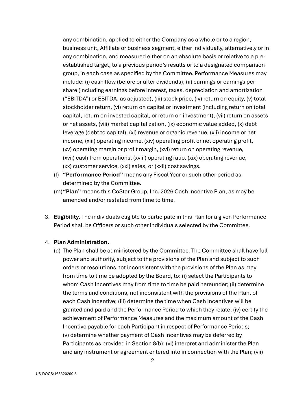 2 US-DOCS\168320290.5 any combination, applied to either the Company as a whole or to a region, business unit, Affiliate or business segment, either individually, alternatively or in any combination, and measured either on an absolute basis or relative to a pre- established target, to a previous period’s results or to a designated comparison group, in each case as specified by the Committee. Performance Measures may include: (i) cash flow (before or after dividends), (ii) earnings or earnings per share (including earnings before interest, taxes, depreciation and amortization (“EBITDA”) or EBITDA, as adjusted), (iii) stock price, (iv) return on equity, (v) total stockholder return, (vi) return on capital or investment (including return on total capital, return on invested capital, or return on investment), (vii) return on assets or net assets, (viii) market capitalization, (ix) economic value added, (x) debt leverage (debt to capital), (xi) revenue or organic revenue, (xii) income or net income, (xiii) operating income, (xiv) operating profit or net operating profit, (xv) operating margin or profit margin, (xvi) return on operating revenue, (xvii) cash from operations, (xviii) operating ratio, (xix) operating revenue, (xx) customer service, (xxi) sales, or (xxii) cost savings. (l) “Performance Period” means any Fiscal Year or such other period as determined by the Committee. (m) “Plan” means this CoStar Group, Inc. 2026 Cash Incentive Plan, as may be amended and/or restated from time to time. 3. Eligibility. The individuals eligible to participate in this Plan for a given Performance Period shall be Officers or such other individuals selected by the Committee. 4. Plan Administration. (a) The Plan shall be administered by the Committee. The Committee shall have full power and authority, subject to the provisions of the Plan and subject to such orders or resolutions not inconsistent with the provisions of the Plan as may from time to time be adopted by the Board, to: (i) select the Participants to whom Cash Incentives may from time to time be paid hereunder; (ii) determine the terms and conditions, not inconsistent with the provisions of the Plan, of each Cash Incentive; (iii) determine the time when Cash Incentives will be granted and paid and the Performance Period to which they relate; (iv) certify the achievement of Performance Measures and the maximum amount of the Cash Incentive payable for each Participant in respect of Performance Periods; (v) determine whether payment of Cash Incentives may be deferred by Participants as provided in Section 8(b); (vi) interpret and administer the Plan and any instrument or agreement entered into in connection with the Plan; (vii)