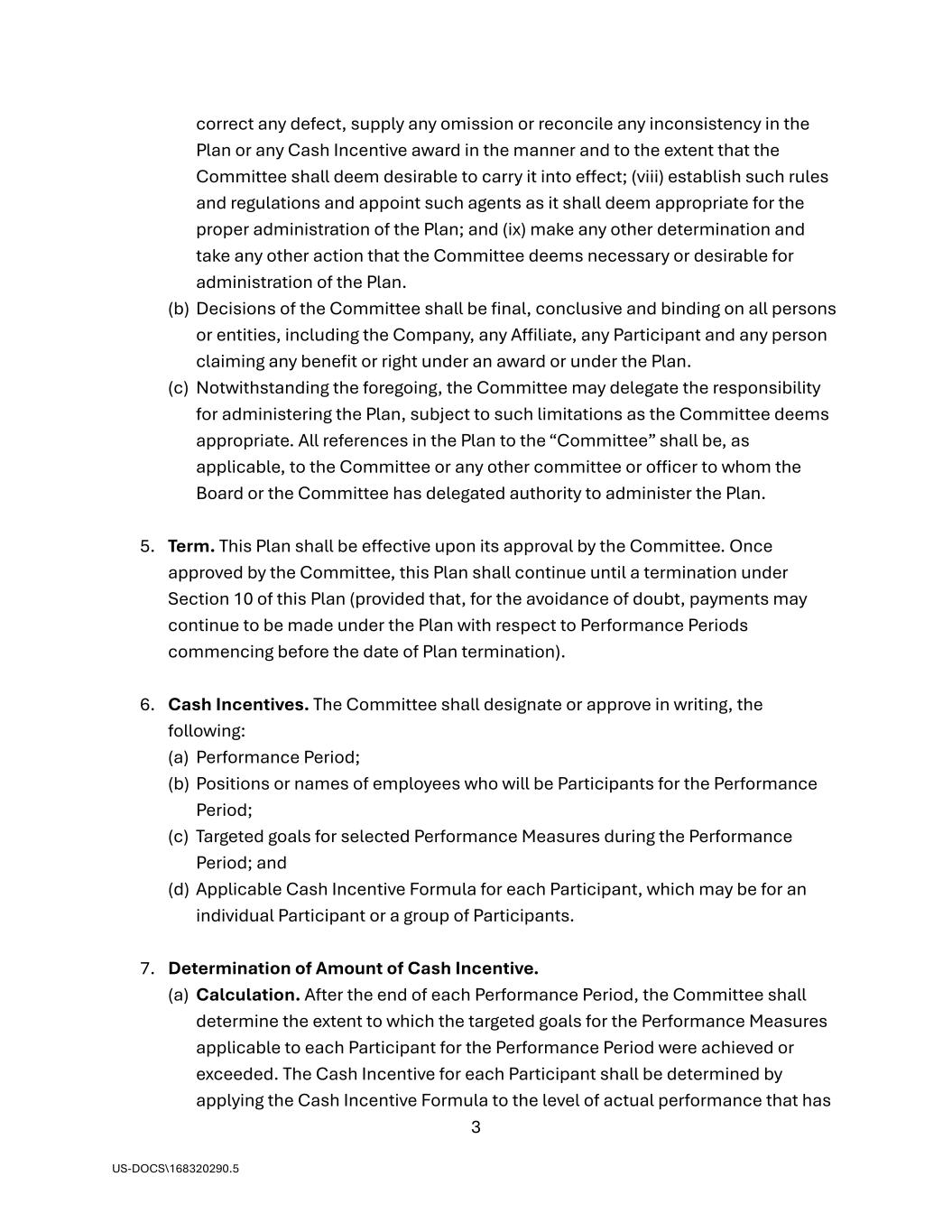 3 US-DOCS\168320290.5 correct any defect, supply any omission or reconcile any inconsistency in the Plan or any Cash Incentive award in the manner and to the extent that the Committee shall deem desirable to carry it into effect; (viii) establish such rules and regulations and appoint such agents as it shall deem appropriate for the proper administration of the Plan; and (ix) make any other determination and take any other action that the Committee deems necessary or desirable for administration of the Plan. (b) Decisions of the Committee shall be final, conclusive and binding on all persons or entities, including the Company, any Affiliate, any Participant and any person claiming any benefit or right under an award or under the Plan. (c) Notwithstanding the foregoing, the Committee may delegate the responsibility for administering the Plan, subject to such limitations as the Committee deems appropriate. All references in the Plan to the “Committee” shall be, as applicable, to the Committee or any other committee or officer to whom the Board or the Committee has delegated authority to administer the Plan. 5. Term. This Plan shall be effective upon its approval by the Committee. Once approved by the Committee, this Plan shall continue until a termination under Section 10 of this Plan (provided that, for the avoidance of doubt, payments may continue to be made under the Plan with respect to Performance Periods commencing before the date of Plan termination). 6. Cash Incentives. The Committee shall designate or approve in writing, the following: (a) Performance Period; (b) Positions or names of employees who will be Participants for the Performance Period; (c) Targeted goals for selected Performance Measures during the Performance Period; and (d) Applicable Cash Incentive Formula for each Participant, which may be for an individual Participant or a group of Participants. 7. Determination of Amount of Cash Incentive. (a) Calculation. After the end of each Performance Period, the Committee shall determine the extent to which the targeted goals for the Performance Measures applicable to each Participant for the Performance Period were achieved or exceeded. The Cash Incentive for each Participant shall be determined by applying the Cash Incentive Formula to the level of actual performance that has