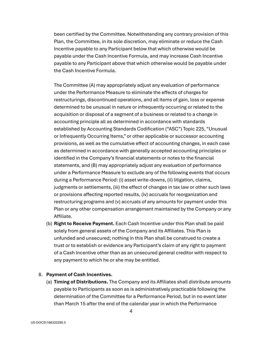4 US-DOCS\168320290.5 been certified by the Committee. Notwithstanding any contrary provision of this Plan, the Committee, in its sole discretion, may eliminate or reduce the Cash Incentive payable to any Participant below that which otherwise would be payable under the Cash Incentive Formula, and may increase Cash Incentive payable to any Participant above that which otherwise would be payable under the Cash Incentive Formula. The Committee (A) may appropriately adjust any evaluation of performance under the Performance Measure to eliminate the effects of charges for restructurings, discontinued operations, and all items of gain, loss or expense determined to be unusual in nature or infrequently occurring or related to the acquisition or disposal of a segment of a business or related to a change in accounting principle all as determined in accordance with standards established by Accounting Standards Codification (“ASC”) Topic 225, “Unusual or Infrequently Occurring Items,” or other applicable or successor accounting provisions, as well as the cumulative effect of accounting changes, in each case as determined in accordance with generally accepted accounting principles or identified in the Company’s financial statements or notes to the financial statements, and (B) may appropriately adjust any evaluation of performance under a Performance Measure to exclude any of the following events that occurs during a Performance Period: (i) asset write-downs, (ii) litigation, claims, judgments or settlements, (iii) the effect of changes in tax law or other such laws or provisions affecting reported results, (iv) accruals for reorganization and restructuring programs and (v) accruals of any amounts for payment under this Plan or any other compensation arrangement maintained by the Company or any Affiliate. (b) Right to Receive Payment. Each Cash Incentive under this Plan shall be paid solely from general assets of the Company and its Affiliates. This Plan is unfunded and unsecured; nothing in this Plan shall be construed to create a trust or to establish or evidence any Participant’s claim of any right to payment of a Cash Incentive other than as an unsecured general creditor with respect to any payment to which he or she may be entitled. 8. Payment of Cash Incentives. (a) Timing of Distributions. The Company and its Affiliates shall distribute amounts payable to Participants as soon as is administratively practicable following the determination of the Committee for a Performance Period, but in no event later than March 15 after the end of the calendar year in which the Performance