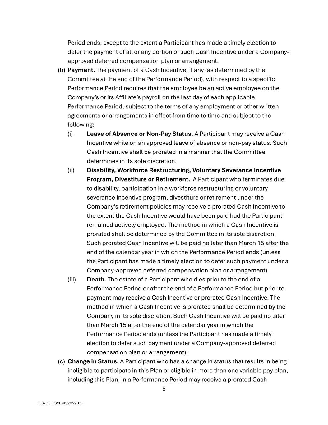5 US-DOCS\168320290.5 Period ends, except to the extent a Participant has made a timely election to defer the payment of all or any portion of such Cash Incentive under a Company- approved deferred compensation plan or arrangement. (b) Payment. The payment of a Cash Incentive, if any (as determined by the Committee at the end of the Performance Period), with respect to a specific Performance Period requires that the employee be an active employee on the Company’s or its Affiliate’s payroll on the last day of each applicable Performance Period, subject to the terms of any employment or other written agreements or arrangements in effect from time to time and subject to the following: (i) Leave of Absence or Non-Pay Status. A Participant may receive a Cash Incentive while on an approved leave of absence or non-pay status. Such Cash Incentive shall be prorated in a manner that the Committee determines in its sole discretion. (ii) Disability, Workforce Restructuring, Voluntary Severance Incentive Program, Divestiture or Retirement. A Participant who terminates due to disability, participation in a workforce restructuring or voluntary severance incentive program, divestiture or retirement under the Company’s retirement policies may receive a prorated Cash Incentive to the extent the Cash Incentive would have been paid had the Participant remained actively employed. The method in which a Cash Incentive is prorated shall be determined by the Committee in its sole discretion. Such prorated Cash Incentive will be paid no later than March 15 after the end of the calendar year in which the Performance Period ends (unless the Participant has made a timely election to defer such payment under a Company-approved deferred compensation plan or arrangement). (iii) Death. The estate of a Participant who dies prior to the end of a Performance Period or after the end of a Performance Period but prior to payment may receive a Cash Incentive or prorated Cash Incentive. The method in which a Cash Incentive is prorated shall be determined by the Company in its sole discretion. Such Cash Incentive will be paid no later than March 15 after the end of the calendar year in which the Performance Period ends (unless the Participant has made a timely election to defer such payment under a Company-approved deferred compensation plan or arrangement). (c) Change in Status. A Participant who has a change in status that results in being ineligible to participate in this Plan or eligible in more than one variable pay plan, including this Plan, in a Performance Period may receive a prorated Cash