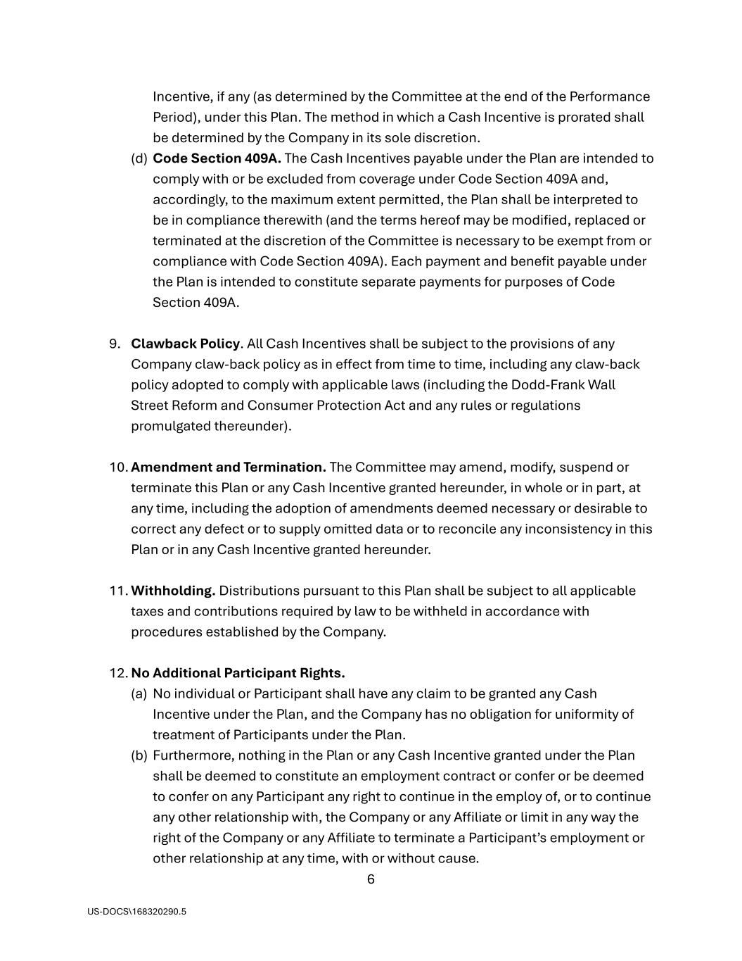 6 US-DOCS\168320290.5 Incentive, if any (as determined by the Committee at the end of the Performance Period), under this Plan. The method in which a Cash Incentive is prorated shall be determined by the Company in its sole discretion. (d) Code Section 409A. The Cash Incentives payable under the Plan are intended to comply with or be excluded from coverage under Code Section 409A and, accordingly, to the maximum extent permitted, the Plan shall be interpreted to be in compliance therewith (and the terms hereof may be modified, replaced or terminated at the discretion of the Committee is necessary to be exempt from or compliance with Code Section 409A). Each payment and benefit payable under the Plan is intended to constitute separate payments for purposes of Code Section 409A. 9. Clawback Policy. All Cash Incentives shall be subject to the provisions of any Company claw-back policy as in effect from time to time, including any claw-back policy adopted to comply with applicable laws (including the Dodd-Frank Wall Street Reform and Consumer Protection Act and any rules or regulations promulgated thereunder). 10. Amendment and Termination. The Committee may amend, modify, suspend or terminate this Plan or any Cash Incentive granted hereunder, in whole or in part, at any time, including the adoption of amendments deemed necessary or desirable to correct any defect or to supply omitted data or to reconcile any inconsistency in this Plan or in any Cash Incentive granted hereunder. 11. Withholding. Distributions pursuant to this Plan shall be subject to all applicable taxes and contributions required by law to be withheld in accordance with procedures established by the Company. 12. No Additional Participant Rights. (a) No individual or Participant shall have any claim to be granted any Cash Incentive under the Plan, and the Company has no obligation for uniformity of treatment of Participants under the Plan. (b) Furthermore, nothing in the Plan or any Cash Incentive granted under the Plan shall be deemed to constitute an employment contract or confer or be deemed to confer on any Participant any right to continue in the employ of, or to continue any other relationship with, the Company or any Affiliate or limit in any way the right of the Company or any Affiliate to terminate a Participant’s employment or other relationship at any time, with or without cause.