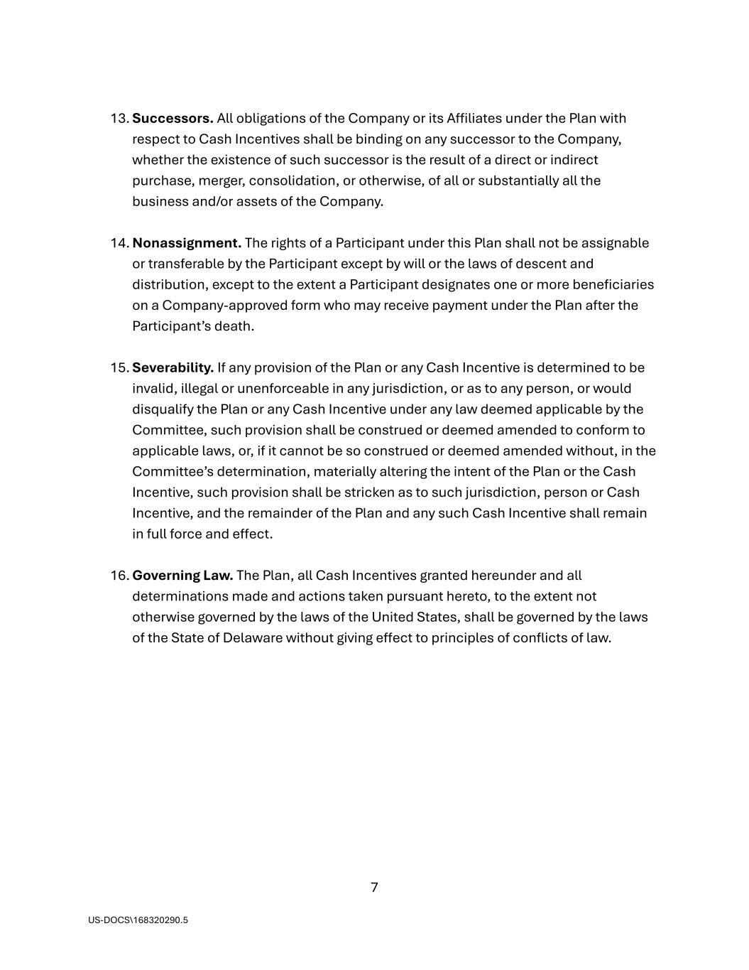 7 US-DOCS\168320290.5 13. Successors. All obligations of the Company or its Affiliates under the Plan with respect to Cash Incentives shall be binding on any successor to the Company, whether the existence of such successor is the result of a direct or indirect purchase, merger, consolidation, or otherwise, of all or substantially all the business and/or assets of the Company. 14. Nonassignment. The rights of a Participant under this Plan shall not be assignable or transferable by the Participant except by will or the laws of descent and distribution, except to the extent a Participant designates one or more beneficiaries on a Company-approved form who may receive payment under the Plan after the Participant’s death. 15. Severability. If any provision of the Plan or any Cash Incentive is determined to be invalid, illegal or unenforceable in any jurisdiction, or as to any person, or would disqualify the Plan or any Cash Incentive under any law deemed applicable by the Committee, such provision shall be construed or deemed amended to conform to applicable laws, or, if it cannot be so construed or deemed amended without, in the Committee’s determination, materially altering the intent of the Plan or the Cash Incentive, such provision shall be stricken as to such jurisdiction, person or Cash Incentive, and the remainder of the Plan and any such Cash Incentive shall remain in full force and effect. 16. Governing Law. The Plan, all Cash Incentives granted hereunder and all determinations made and actions taken pursuant hereto, to the extent not otherwise governed by the laws of the United States, shall be governed by the laws of the State of Delaware without giving effect to principles of conflicts of law.