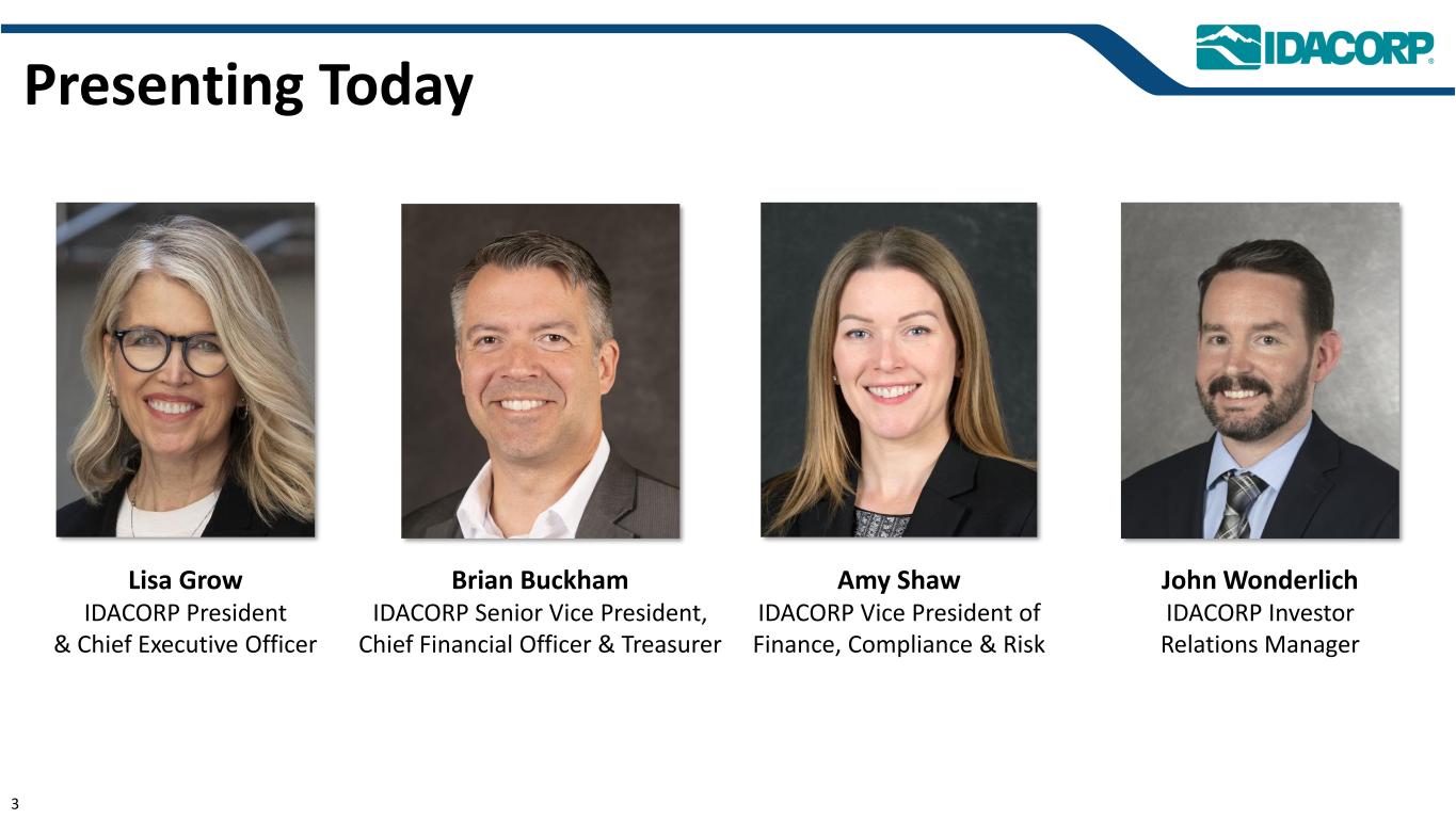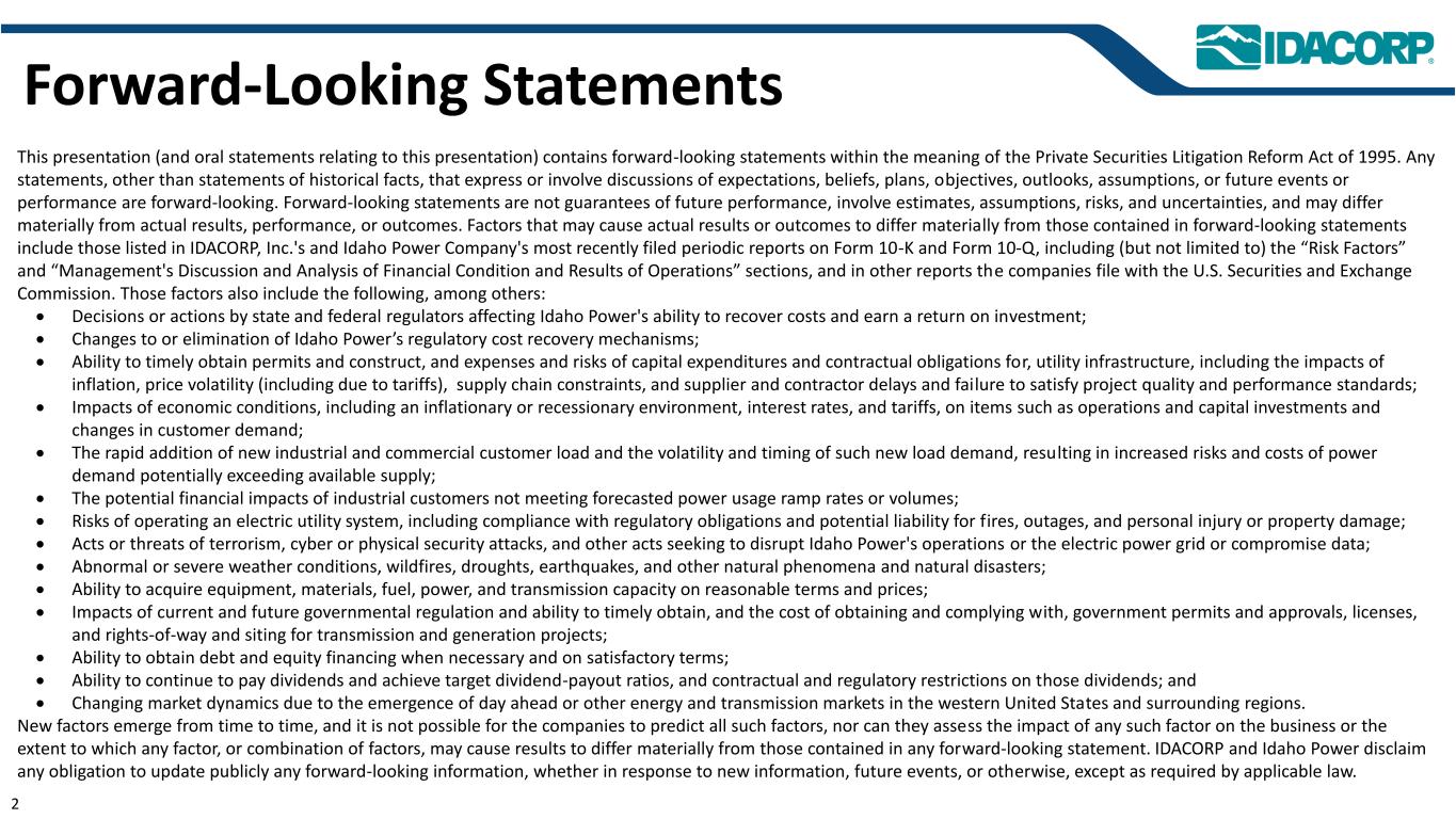 Forward-Looking Statements This presentation (and oral statements relating to this presentation) contains forward-looking statements within the meaning of the Private Securities Litigation Reform Act of 1995. Any statements, other than statements of historical facts, that express or involve discussions of expectations, beliefs, plans, objectives, outlooks, assumptions, or future events or performance are forward-looking. Forward-looking statements are not guarantees of future performance, involve estimates, assumptions, risks, and uncertainties, and may differ materially from actual results, performance, or outcomes. Factors that may cause actual results or outcomes to differ materially from those contained in forward-looking statements include those listed in IDACORP, Inc.'s and Idaho Power Company's most recently filed periodic reports on Form 10-K and Form 10-Q, including (but not limited to) the “Risk Factors” and “Management's Discussion and Analysis of Financial Condition and Results of Operations” sections, and in other reports the companies file with the U.S. Securities and Exchange Commission. Those factors also include the following, among others: • Decisions or actions by state and federal regulators affecting Idaho Power's ability to recover costs and earn a return on investment; • Changes to or elimination of Idaho Power’s regulatory cost recovery mechanisms; • Ability to timely obtain permits and construct, and expenses and risks of capital expenditures and contractual obligations for, utility infrastructure, including the impacts of inflation, price volatility (including due to tariffs), supply chain constraints, and supplier and contractor delays and failure to satisfy project quality and performance standards; • Impacts of economic conditions, including an inflationary or recessionary environment, interest rates, and tariffs, on items such as operations and capital investments and changes in customer demand; • The rapid addition of new industrial and commercial customer load and the volatility and timing of such new load demand, resulting in increased risks and costs of power demand potentially exceeding available supply; • The potential financial impacts of industrial customers not meeting forecasted power usage ramp rates or volumes; • Risks of operating an electric utility system, including compliance with regulatory obligations and potential liability for fires, outages, and personal injury or property damage; • Acts or threats of terrorism, cyber or physical security attacks, and other acts seeking to disrupt Idaho Power's operations or the electric power grid or compromise data; • Abnormal or severe weather conditions, wildfires, droughts, earthquakes, and other natural phenomena and natural disasters; • Ability to acquire equipment, materials, fuel, power, and transmission capacity on reasonable terms and prices; • Impacts of current and future governmental regulation and ability to timely obtain, and the cost of obtaining and complying with, government permits and approvals, licenses, and rights-of-way and siting for transmission and generation projects; • Ability to obtain debt and equity financing when necessary and on satisfactory terms; • Ability to continue to pay dividends and achieve target dividend-payout ratios, and contractual and regulatory restrictions on those dividends; and • Changing market dynamics due to the emergence of day ahead or other energy and transmission markets in the western United States and surrounding regions. New factors emerge from time to time, and it is not possible for the companies to predict all such factors, nor can they assess the impact of any such factor on the business or the extent to which any factor, or combination of factors, may cause results to differ materially from those contained in any forward-looking statement. IDACORP and Idaho Power disclaim any obligation to update publicly any forward-looking information, whether in response to new information, future events, or otherwise, except as required by applicable law. 2