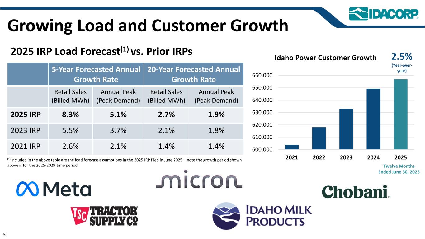Growing Load and Customer Growth 5-Year Forecasted Annual Growth Rate 20-Year Forecasted Annual Growth Rate Retail Sales (Billed MWh) Annual Peak (Peak Demand) Retail Sales (Billed MWh) Annual Peak (Peak Demand) 2025 IRP 8.3% 5.1% 2.7% 1.9% 2023 IRP 5.5% 3.7% 2.1% 1.8% 2021 IRP 2.6% 2.1% 1.4% 1.4% 2025 IRP Load Forecast(1) vs. Prior IRPs (1) Included in the above table are the load forecast assumptions in the 2025 IRP filed in June 2025 – note the growth period shown above is for the 2025-2029 time period. 2.5% (Year-over- year) Idaho Power Customer Growth 600,000 610,000 620,000 630,000 640,000 650,000 660,000 2021 2022 2023 2024 2025 Twelve Months Ended June 30, 2025 5
