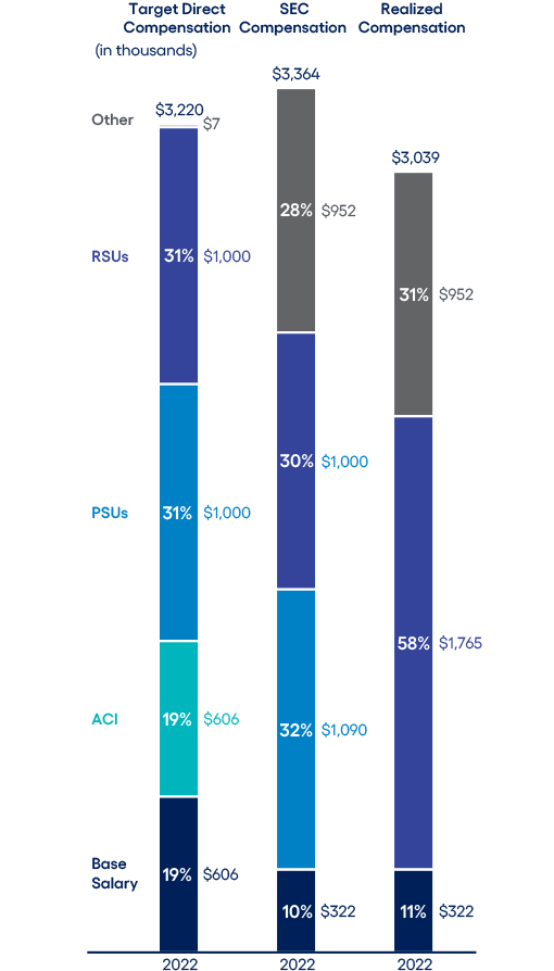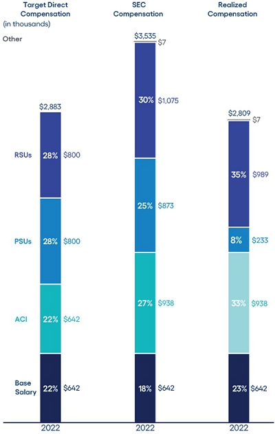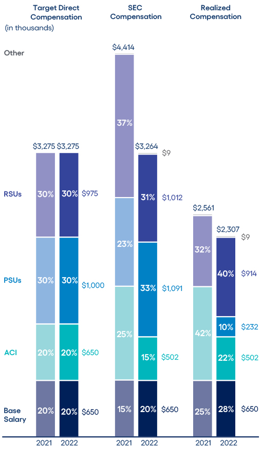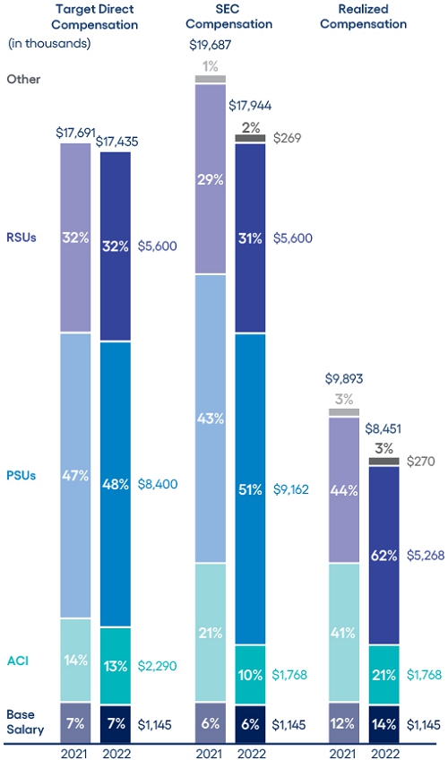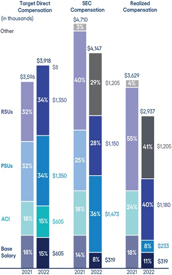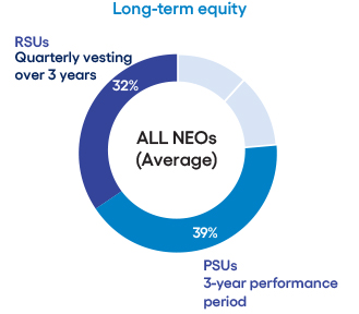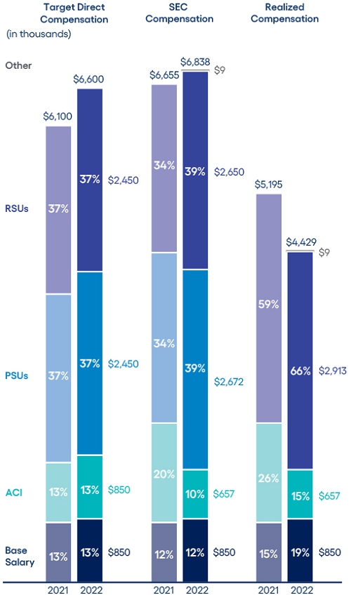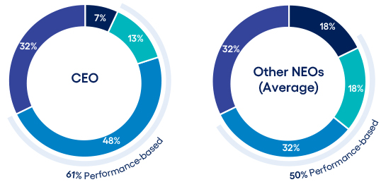CEO compensation assessment CEO pay ratio Clawback policy Compensation consultant Compensation mix Death benefits Executive stock ownership guidelines Peer group Perquisites Prohibitions on hedging, short sales, margin accounts and pledging Retirement, death and disability policy Severance benefits Summary compensation table |