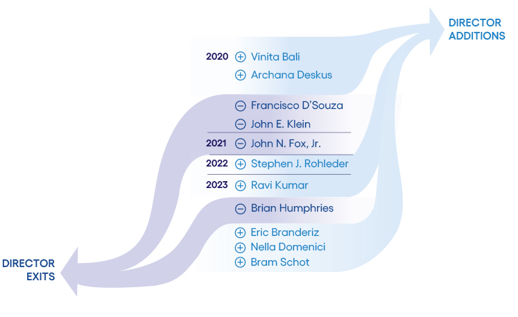 The Board strives to optimize its balance of skills, knowledge, experiences and tenures to provide Cognizant with effective directors who can help navigate its changing business needs. In February 2023, Cognizant appointed two independent directors to its Board, Eric Branderiz and Nella Domenici, followed by Abraham “Bram” Schot in April 2023. Each of our new directors brings a wealth of knowledge and experience to the Board.