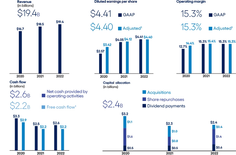 In 2022, Cognizant delivered full-year revenue of $19.4 billion, or year-over-year growth of 5% (7.5% on a constant currency1 basis). In addition, Cognizant continued to execute on its balanced capital allocation framework, returning nearly $2 billion to shareholders through dividends and share repurchases.