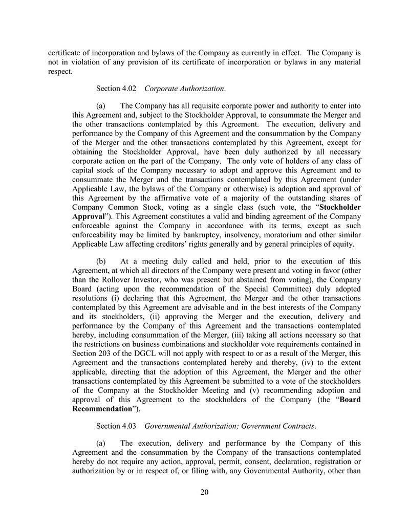 Section 4.02 Corporate Authorization ........................................................................... 20