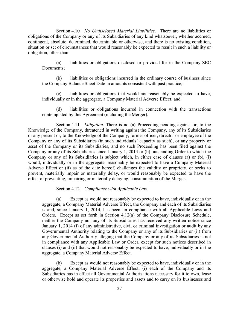 Section 4.12 Compliance with Applicable Law ............................................................ 27