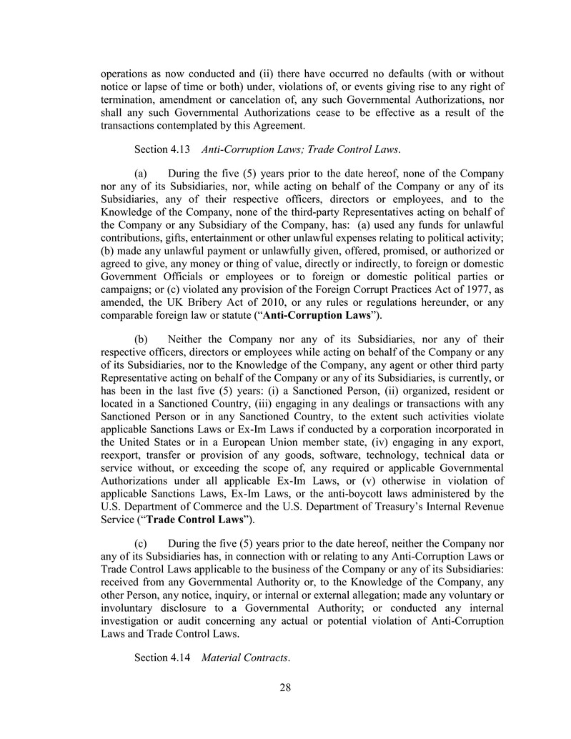 Section 4.13 Anti-Corruption Laws; Trade Control Laws ............................................. 28
