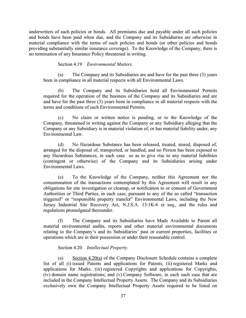 The Agreement and Plan of Merger (the “Agreement”) contains representations, warranties and