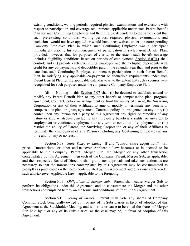 Section 6.09 Obligations of Merger Sub........................................................................ 61