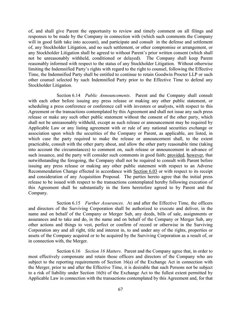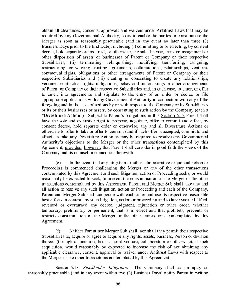 Section 6.13 Stockholder Litigation .............................................................................. 66