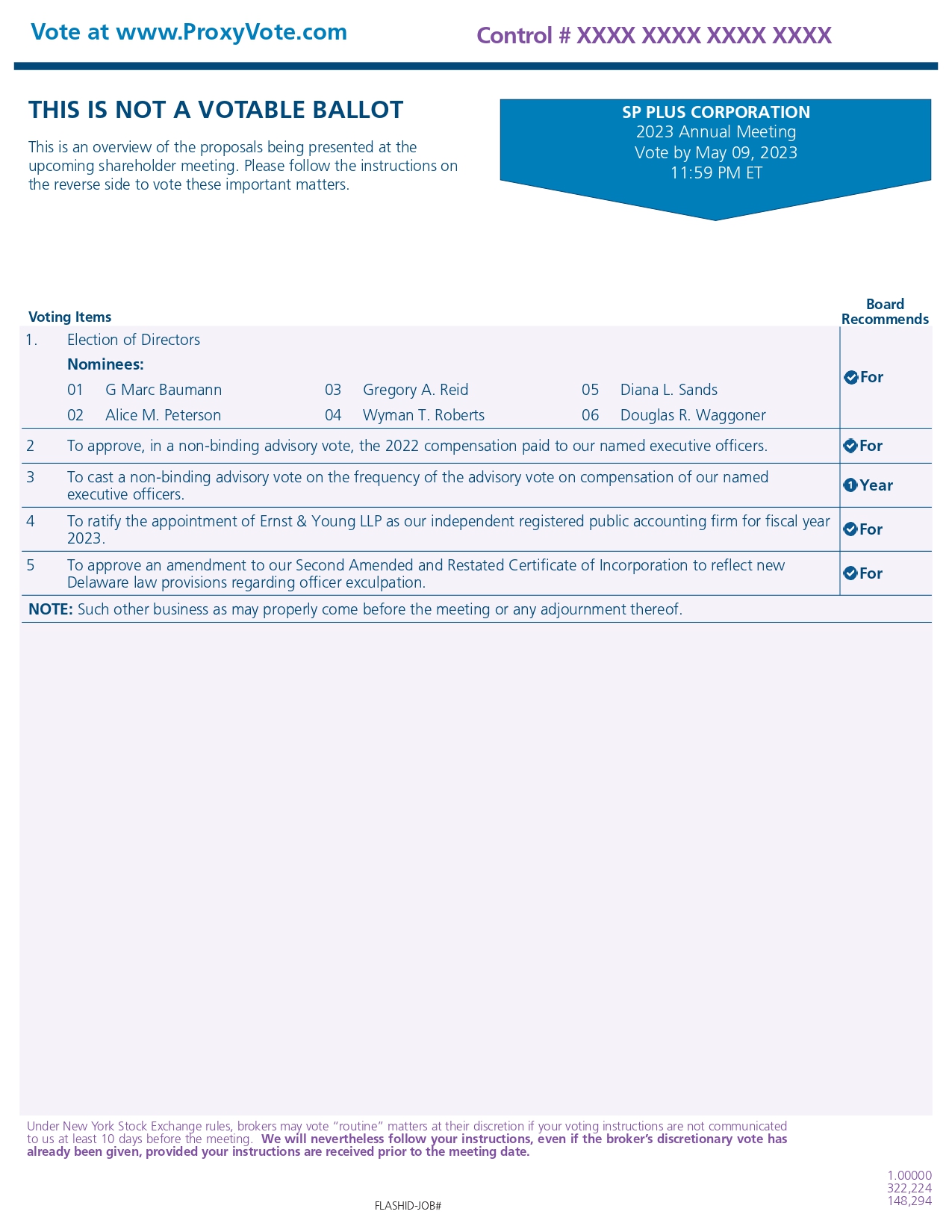 Voting Items Board Recommends THIS IS NOT A VOTABLE BALLOT This is an overview of the proposals being presented at the upcoming shareholder meeting. Please follow the instructions on the reverse side to vote these important matters. Vote at www.ProxyVote.com FLASHID-JOB# Control # XXXX XXXX XXXX XXXX 1.00000 322,224 148,294 Under New York Stock Exchange rules, brokers may vote “routine” matters at their discretion if your voting instructions are not communicated to us at least 10 days before the meeting. We will nevertheless follow your instructions, even if the broker’s discretionary vote has already been given, provided your instructions are received prior to the meeting date. SP PLUS CORPORATION 2023 Annual Meeting Vote by May 09, 2023 11:59 PM ET 1. Election of Directors Nominees: 01 G Marc Baumann 03 Gregory A. Reid 05 Diana L. Sands 02 Alice M. Peterson 04 Wyman T. Roberts 06 Douglas R. Waggoner For 2 To approve, in a non-binding advisory vote, the 2022 compensation paid to our named executive officers. For 3 To cast a non-binding advisory vote on the frequency of the advisory vote on compensation of our named executive officers. Year 4 To ratify the appointment of Ernst & Young LLP as our independent registered public accounting firm for fiscal year 2023. For 5 To approve an amendment to our Second Amended and Restated Certificate of Incorporation to reflect new Delaware law provisions regarding officer exculpation. For NOTE: Such other business as may properly come before the meeting or any adjournment thereof.
