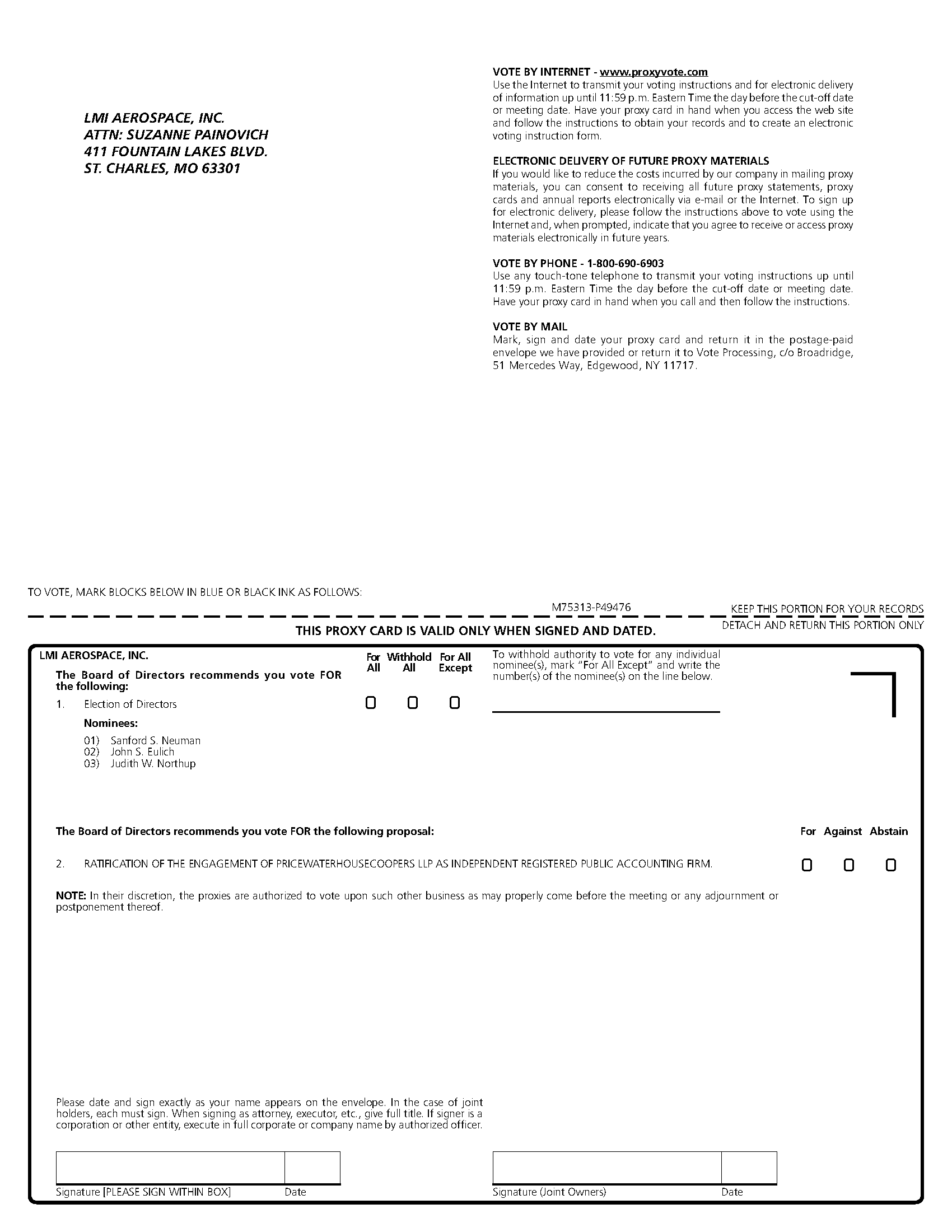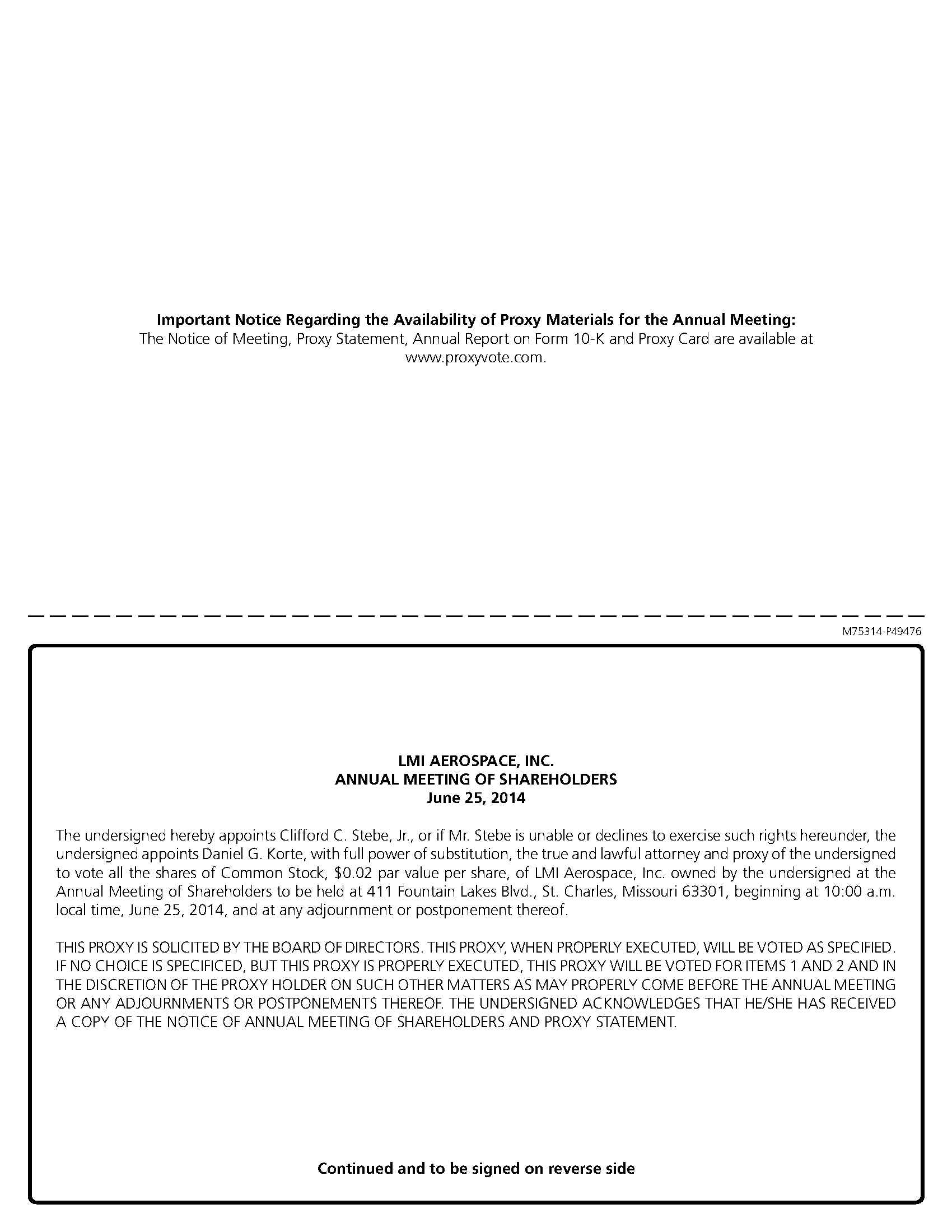 IMPORTANT NOTICE REGARDING THE AVAILABILITY OF PROXY MATERIALS FOR THE ANNUAL MEETING OF SHAREHOLDERS TO BE HELD ON JUNE 25, 2014: THE PROXY STATEMENT, PROXY CARD AND OUR 2013 ANNUAL REPORT ARE ALSO AVAILABLE AT http://ir.lmiaerospace.com/annuals.cfm and at https://materials.proxyvote.com/.