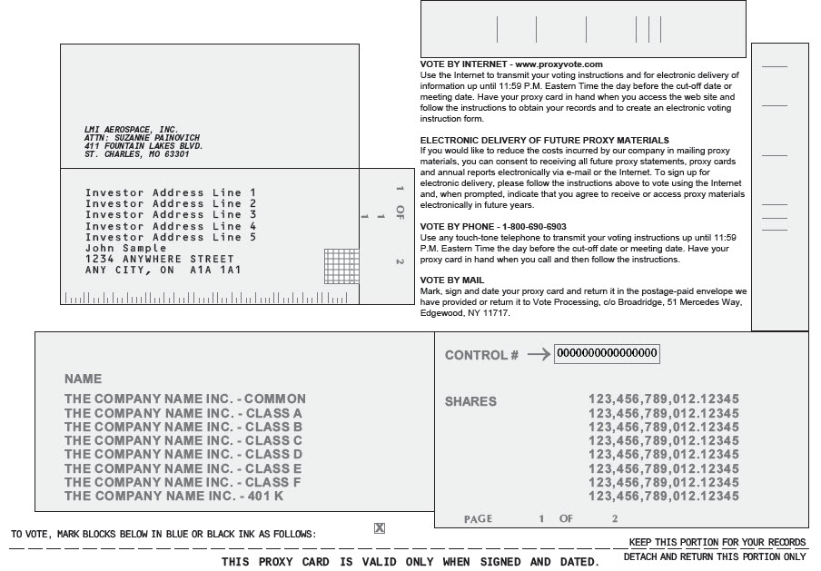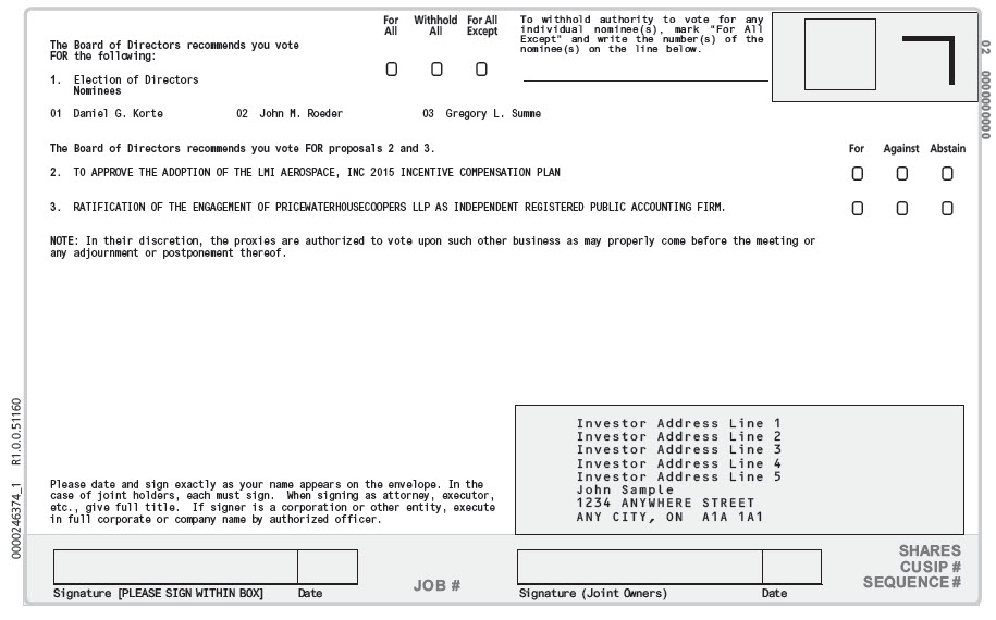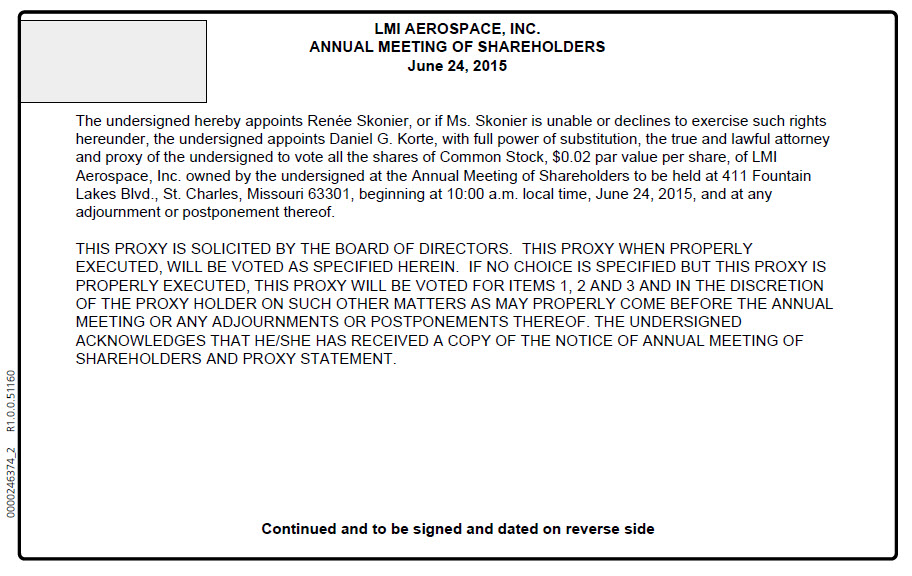 LMI AEROSPACE, INC. ANNUAL MEETING OF SHAREHOLDERS June 24, 2015 The undersigned hereby appoints Renee Skonier, or if Ms. Skonier is unable or declines to exercise such rights hereunder, the undersigned appoints Daniel G. Korte, with full power of substitution, the true and lawful attorney and proxy of the undersigned to vote all the shares of Common Stock, $0.02 par value per share, of LMI Aerospace, Inc. owned by the undersigned at the Annual Meeting of Shareholders to be held at 411 Fountain Lakes Blvd., St. Charles, Missouri 63301, beginning at 10:00 a.m. local time, June 24, 2015, and at any adjournment or postponement thereof. THIS PROXY IS SOLICITED BY THE BOARD OF DIRECTORS. THIS PROXY WHEN PROPERLY EXECUTED, WILL BE VOTED AS SPECIFIED HEREIN. IF NO CHOICE IS SPECIFIED BUT THIS PROXY IS PROPERLY EXECUTED, THIS PROXY WILL BE VOTED FOR ITEMS 1, 2 AND 3 AND IN THE DISCRETION OF THE PROXY HOLDER ON SUCH OTHER MATTERS AS MAY PROPERLY COME BEFORE THE ANNUAL MEETING OR ANY ADJOURNMENTS OR POSTPONEMENTS THEREOF. THE UNDERSIGNED ACKNOWLEDGES THAT HE/SHE HAS RECEIVED A COPY OF THE NOTICE OF ANNUAL MEETING OF SHAREHOLDERS AND PROXY STATEMENT. Continued and to be signed and dated on reverse side