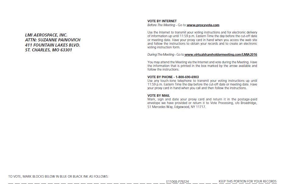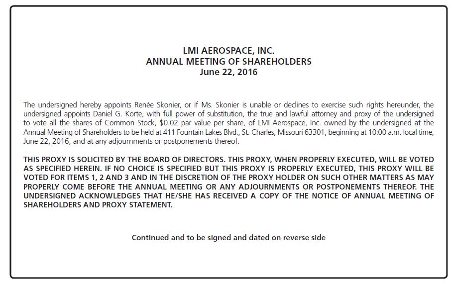 The 2016 Annual Meeting of Shareholders (the “Annual Meeting”) of LMI Aerospace, Inc., a Missouri corporation (the “Company”), will be held at 411 Fountain Lakes Boulevard, St. Charles, Missouri 63301, beginning at 10:00 a.m., local time, on June 22, 2016 for the following purposes: