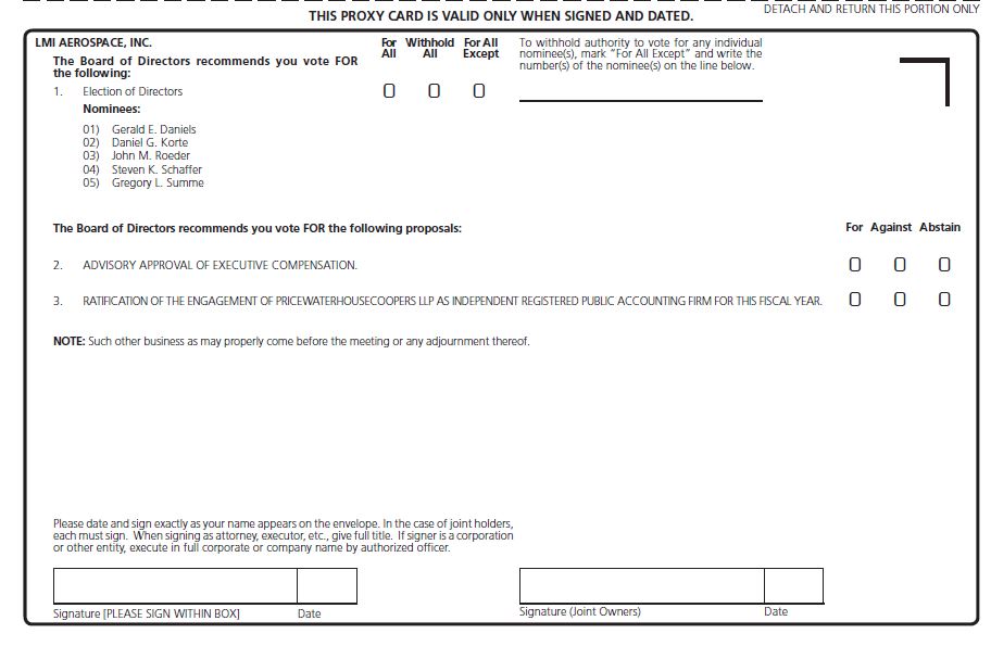 In some instances, only one copy of this Proxy Statement or annual report is being delivered to multiple shareholders sharing an address, unless the Company has received instructions from one or more of the shareholders to continue to deliver multiple copies. We will deliver promptly upon oral or written request a separate copy of the proxy statement or annual report, as applicable, to any shareholder at your address. If you wish to receive a separate copy of the proxy statement or annual report, you may call us at (636) 946-6525 or send a written request to LMI Aerospace, Inc., 411 Fountain Lakes Boulevard, St. Charles, Missouri 63301, Attention: Secretary. Alternatively, shareholders sharing an address who now receive multiple copies of the proxy statement or annual report may request delivery of a single copy also by calling us at the number or writing to us at the address listed above.