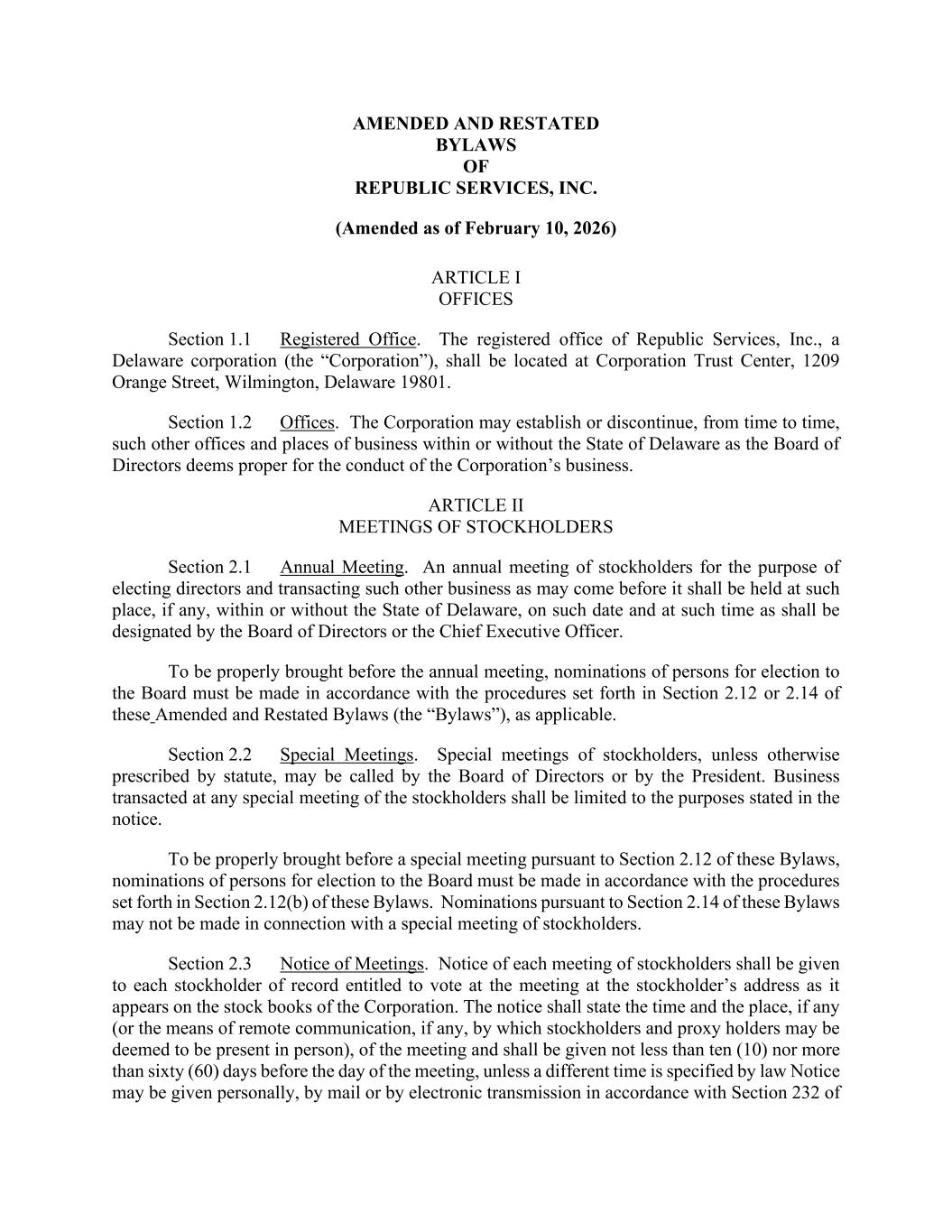 AMENDED AND RESTATED BYLAWS OF REPUBLIC SERVICES, INC. (Amended as of February 10, 2026) ARTICLE I OFFICES Section 1.1 Registered Office. The registered office of Republic Services, Inc., a Delaware corporation (the “Corporation”), shall be located at Corporation Trust Center, 1209 Orange Street, Wilmington, Delaware 19801. Section 1.2 Offices. The Corporation may establish or discontinue, from time to time, such other offices and places of business within or without the State of Delaware as the Board of Directors deems proper for the conduct of the Corporation’s business. ARTICLE II MEETINGS OF STOCKHOLDERS Section 2.1 Annual Meeting. An annual meeting of stockholders for the purpose of electing directors and transacting such other business as may come before it shall be held at such place, if any, within or without the State of Delaware, on such date and at such time as shall be designated by the Board of Directors or the Chief Executive Officer. To be properly brought before the annual meeting, nominations of persons for election to the Board must be made in accordance with the procedures set forth in Section 2.12 or 2.14 of these Amended and Restated Bylaws (the “Bylaws”), as applicable. Section 2.2 Special Meetings. Special meetings of stockholders, unless otherwise prescribed by statute, may be called by the Board of Directors or by the President. Business transacted at any special meeting of the stockholders shall be limited to the purposes stated in the notice. To be properly brought before a special meeting pursuant to Section 2.12 of these Bylaws, nominations of persons for election to the Board must be made in accordance with the procedures set forth in Section 2.12(b) of these Bylaws. Nominations pursuant to Section 2.14 of these Bylaws may not be made in connection with a special meeting of stockholders. Section 2.3 Notice of Meetings. Notice of each meeting of stockholders shall be given to each stockholder of record entitled to vote at the meeting at the stockholder’s address as it appears on the stock books of the Corporation. The notice shall state the time and the place, if any (or the means of remote communication, if any, by which stockholders and proxy holders may be deemed to be present in person), of the meeting and shall be given not less than ten (10) nor more than sixty (60) days before the day of the meeting, unless a different time is specified by law Notice may be given personally, by mail or by electronic transmission in accordance with Section 232 of