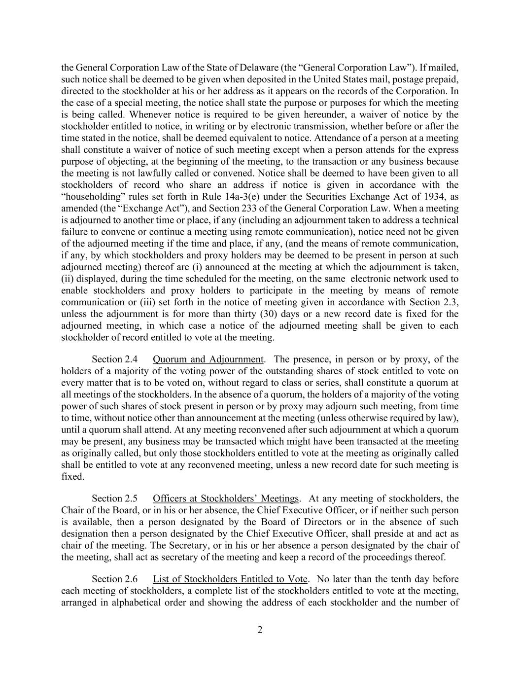 2 the General Corporation Law of the State of Delaware (the “General Corporation Law”). If mailed, such notice shall be deemed to be given when deposited in the United States mail, postage prepaid, directed to the stockholder at his or her address as it appears on the records of the Corporation. In the case of a special meeting, the notice shall state the purpose or purposes for which the meeting is being called. Whenever notice is required to be given hereunder, a waiver of notice by the stockholder entitled to notice, in writing or by electronic transmission, whether before or after the time stated in the notice, shall be deemed equivalent to notice. Attendance of a person at a meeting shall constitute a waiver of notice of such meeting except when a person attends for the express purpose of objecting, at the beginning of the meeting, to the transaction or any business because the meeting is not lawfully called or convened. Notice shall be deemed to have been given to all stockholders of record who share an address if notice is given in accordance with the “householding” rules set forth in Rule 14a-3(e) under the Securities Exchange Act of 1934, as amended (the “Exchange Act”), and Section 233 of the General Corporation Law. When a meeting is adjourned to another time or place, if any (including an adjournment taken to address a technical failure to convene or continue a meeting using remote communication), notice need not be given of the adjourned meeting if the time and place, if any, (and the means of remote communication, if any, by which stockholders and proxy holders may be deemed to be present in person at such adjourned meeting) thereof are (i) announced at the meeting at which the adjournment is taken, (ii) displayed, during the time scheduled for the meeting, on the same electronic network used to enable stockholders and proxy holders to participate in the meeting by means of remote communication or (iii) set forth in the notice of meeting given in accordance with Section 2.3, unless the adjournment is for more than thirty (30) days or a new record date is fixed for the adjourned meeting, in which case a notice of the adjourned meeting shall be given to each stockholder of record entitled to vote at the meeting. Section 2.4 Quorum and Adjournment. The presence, in person or by proxy, of the holders of a majority of the voting power of the outstanding shares of stock entitled to vote on every matter that is to be voted on, without regard to class or series, shall constitute a quorum at all meetings of the stockholders. In the absence of a quorum, the holders of a majority of the voting power of such shares of stock present in person or by proxy may adjourn such meeting, from time to time, without notice other than announcement at the meeting (unless otherwise required by law), until a quorum shall attend. At any meeting reconvened after such adjournment at which a quorum may be present, any business may be transacted which might have been transacted at the meeting as originally called, but only those stockholders entitled to vote at the meeting as originally called shall be entitled to vote at any reconvened meeting, unless a new record date for such meeting is fixed. Section 2.5 Officers at Stockholders’ Meetings. At any meeting of stockholders, the Chair of the Board, or in his or her absence, the Chief Executive Officer, or if neither such person is available, then a person designated by the Board of Directors or in the absence of such designation then a person designated by the Chief Executive Officer, shall preside at and act as chair of the meeting. The Secretary, or in his or her absence a person designated by the chair of the meeting, shall act as secretary of the meeting and keep a record of the proceedings thereof. Section 2.6 List of Stockholders Entitled to Vote. No later than the tenth day before each meeting of stockholders, a complete list of the stockholders entitled to vote at the meeting, arranged in alphabetical order and showing the address of each stockholder and the number of
