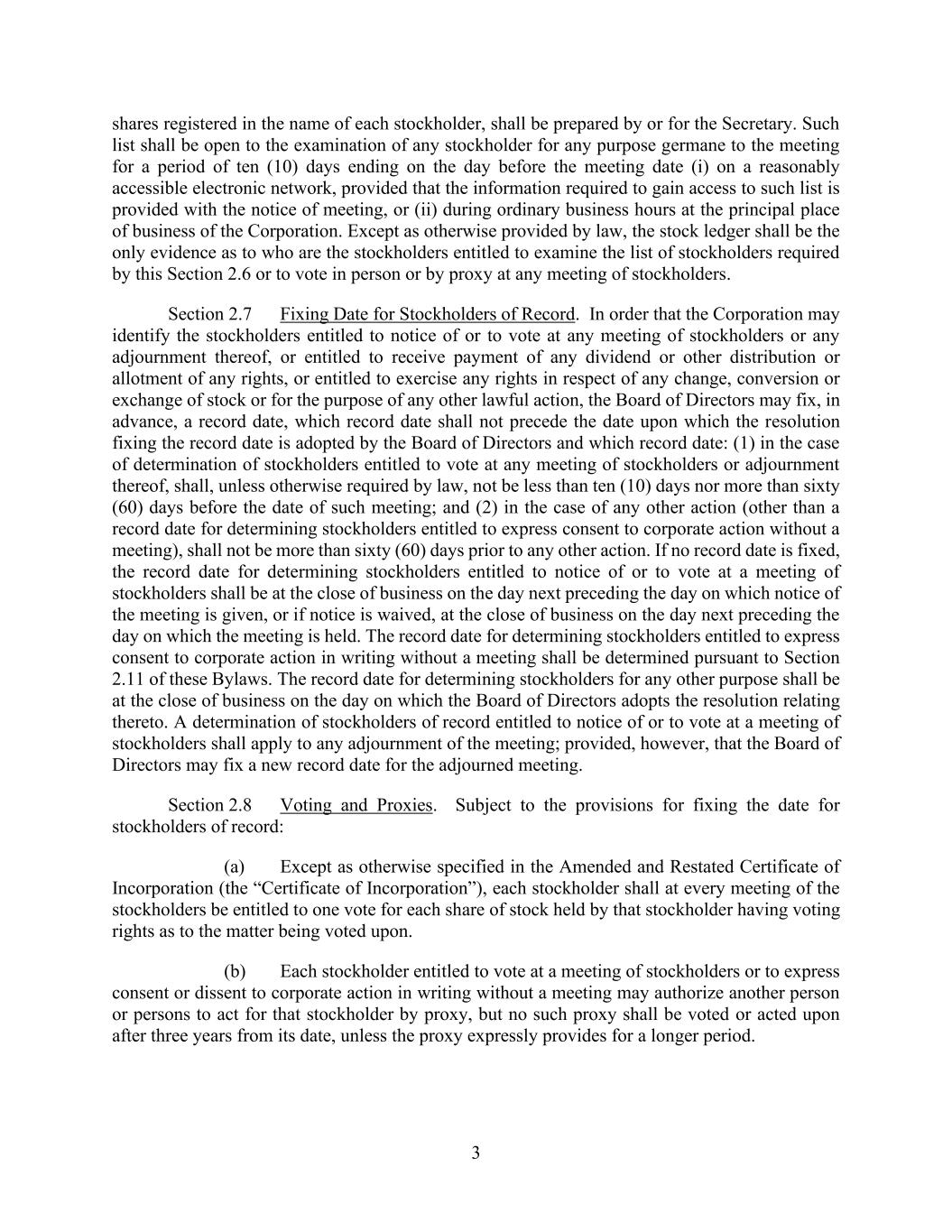 3 shares registered in the name of each stockholder, shall be prepared by or for the Secretary. Such list shall be open to the examination of any stockholder for any purpose germane to the meeting for a period of ten (10) days ending on the day before the meeting date (i) on a reasonably accessible electronic network, provided that the information required to gain access to such list is provided with the notice of meeting, or (ii) during ordinary business hours at the principal place of business of the Corporation. Except as otherwise provided by law, the stock ledger shall be the only evidence as to who are the stockholders entitled to examine the list of stockholders required by this Section 2.6 or to vote in person or by proxy at any meeting of stockholders. Section 2.7 Fixing Date for Stockholders of Record. In order that the Corporation may identify the stockholders entitled to notice of or to vote at any meeting of stockholders or any adjournment thereof, or entitled to receive payment of any dividend or other distribution or allotment of any rights, or entitled to exercise any rights in respect of any change, conversion or exchange of stock or for the purpose of any other lawful action, the Board of Directors may fix, in advance, a record date, which record date shall not precede the date upon which the resolution fixing the record date is adopted by the Board of Directors and which record date: (1) in the case of determination of stockholders entitled to vote at any meeting of stockholders or adjournment thereof, shall, unless otherwise required by law, not be less than ten (10) days nor more than sixty (60) days before the date of such meeting; and (2) in the case of any other action (other than a record date for determining stockholders entitled to express consent to corporate action without a meeting), shall not be more than sixty (60) days prior to any other action. If no record date is fixed, the record date for determining stockholders entitled to notice of or to vote at a meeting of stockholders shall be at the close of business on the day next preceding the day on which notice of the meeting is given, or if notice is waived, at the close of business on the day next preceding the day on which the meeting is held. The record date for determining stockholders entitled to express consent to corporate action in writing without a meeting shall be determined pursuant to Section 2.11 of these Bylaws. The record date for determining stockholders for any other purpose shall be at the close of business on the day on which the Board of Directors adopts the resolution relating thereto. A determination of stockholders of record entitled to notice of or to vote at a meeting of stockholders shall apply to any adjournment of the meeting; provided, however, that the Board of Directors may fix a new record date for the adjourned meeting. Section 2.8 Voting and Proxies. Subject to the provisions for fixing the date for stockholders of record: (a) Except as otherwise specified in the Amended and Restated Certificate of Incorporation (the “Certificate of Incorporation”), each stockholder shall at every meeting of the stockholders be entitled to one vote for each share of stock held by that stockholder having voting rights as to the matter being voted upon. (b) Each stockholder entitled to vote at a meeting of stockholders or to express consent or dissent to corporate action in writing without a meeting may authorize another person or persons to act for that stockholder by proxy, but no such proxy shall be voted or acted upon after three years from its date, unless the proxy expressly provides for a longer period.