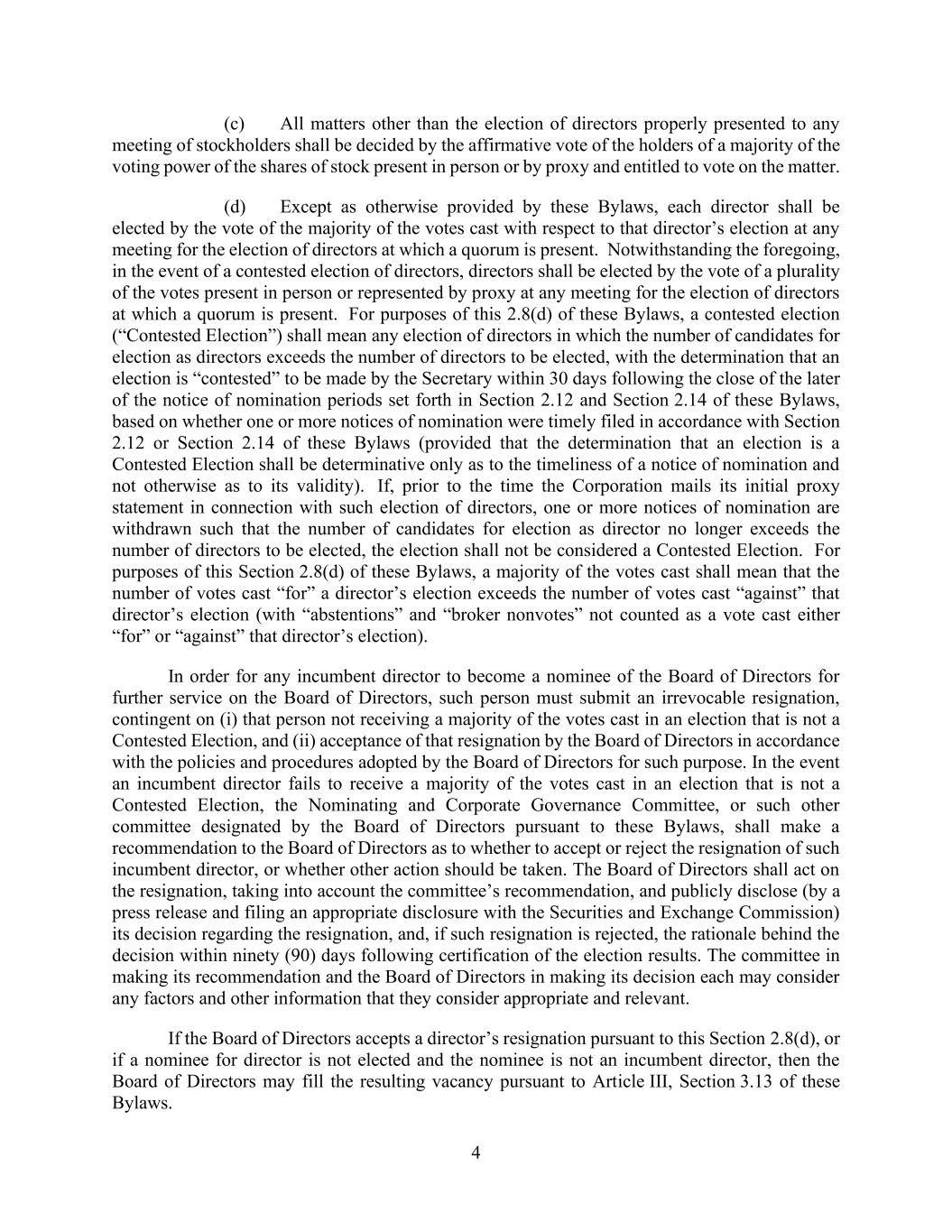 4 (c) All matters other than the election of directors properly presented to any meeting of stockholders shall be decided by the affirmative vote of the holders of a majority of the voting power of the shares of stock present in person or by proxy and entitled to vote on the matter. (d) Except as otherwise provided by these Bylaws, each director shall be elected by the vote of the majority of the votes cast with respect to that director’s election at any meeting for the election of directors at which a quorum is present. Notwithstanding the foregoing, in the event of a contested election of directors, directors shall be elected by the vote of a plurality of the votes present in person or represented by proxy at any meeting for the election of directors at which a quorum is present. For purposes of this 2.8(d) of these Bylaws, a contested election (“Contested Election”) shall mean any election of directors in which the number of candidates for election as directors exceeds the number of directors to be elected, with the determination that an election is “contested” to be made by the Secretary within 30 days following the close of the later of the notice of nomination periods set forth in Section 2.12 and Section 2.14 of these Bylaws, based on whether one or more notices of nomination were timely filed in accordance with Section 2.12 or Section 2.14 of these Bylaws (provided that the determination that an election is a Contested Election shall be determinative only as to the timeliness of a notice of nomination and not otherwise as to its validity). If, prior to the time the Corporation mails its initial proxy statement in connection with such election of directors, one or more notices of nomination are withdrawn such that the number of candidates for election as director no longer exceeds the number of directors to be elected, the election shall not be considered a Contested Election. For purposes of this Section 2.8(d) of these Bylaws, a majority of the votes cast shall mean that the number of votes cast “for” a director’s election exceeds the number of votes cast “against” that director’s election (with “abstentions” and “broker nonvotes” not counted as a vote cast either “for” or “against” that director’s election). In order for any incumbent director to become a nominee of the Board of Directors for further service on the Board of Directors, such person must submit an irrevocable resignation, contingent on (i) that person not receiving a majority of the votes cast in an election that is not a Contested Election, and (ii) acceptance of that resignation by the Board of Directors in accordance with the policies and procedures adopted by the Board of Directors for such purpose. In the event an incumbent director fails to receive a majority of the votes cast in an election that is not a Contested Election, the Nominating and Corporate Governance Committee, or such other committee designated by the Board of Directors pursuant to these Bylaws, shall make a recommendation to the Board of Directors as to whether to accept or reject the resignation of such incumbent director, or whether other action should be taken. The Board of Directors shall act on the resignation, taking into account the committee’s recommendation, and publicly disclose (by a press release and filing an appropriate disclosure with the Securities and Exchange Commission) its decision regarding the resignation, and, if such resignation is rejected, the rationale behind the decision within ninety (90) days following certification of the election results. The committee in making its recommendation and the Board of Directors in making its decision each may consider any factors and other information that they consider appropriate and relevant. If the Board of Directors accepts a director’s resignation pursuant to this Section 2.8(d), or if a nominee for director is not elected and the nominee is not an incumbent director, then the Board of Directors may fill the resulting vacancy pursuant to Article III, Section 3.13 of these Bylaws.