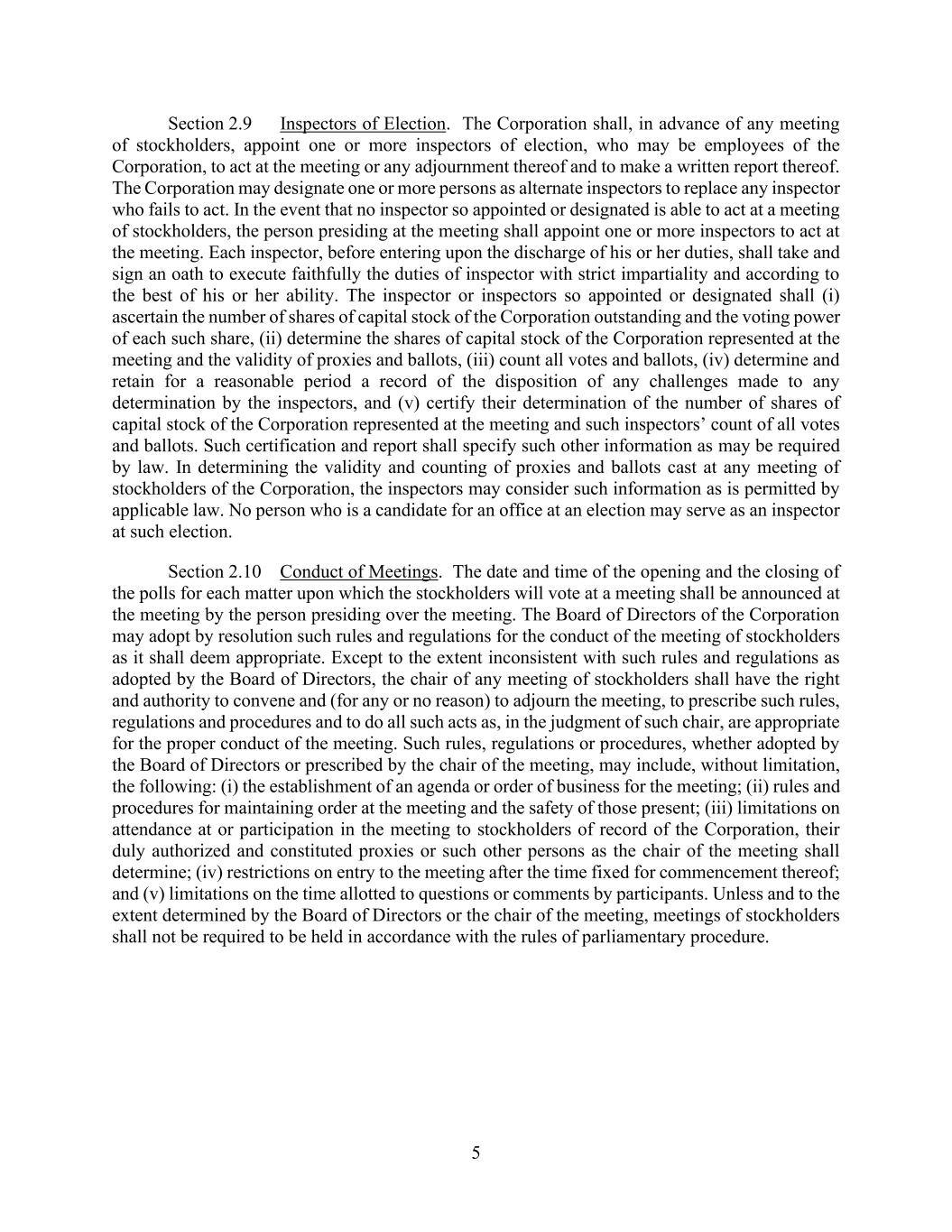 5 Section 2.9 Inspectors of Election. The Corporation shall, in advance of any meeting of stockholders, appoint one or more inspectors of election, who may be employees of the Corporation, to act at the meeting or any adjournment thereof and to make a written report thereof. The Corporation may designate one or more persons as alternate inspectors to replace any inspector who fails to act. In the event that no inspector so appointed or designated is able to act at a meeting of stockholders, the person presiding at the meeting shall appoint one or more inspectors to act at the meeting. Each inspector, before entering upon the discharge of his or her duties, shall take and sign an oath to execute faithfully the duties of inspector with strict impartiality and according to the best of his or her ability. The inspector or inspectors so appointed or designated shall (i) ascertain the number of shares of capital stock of the Corporation outstanding and the voting power of each such share, (ii) determine the shares of capital stock of the Corporation represented at the meeting and the validity of proxies and ballots, (iii) count all votes and ballots, (iv) determine and retain for a reasonable period a record of the disposition of any challenges made to any determination by the inspectors, and (v) certify their determination of the number of shares of capital stock of the Corporation represented at the meeting and such inspectors’ count of all votes and ballots. Such certification and report shall specify such other information as may be required by law. In determining the validity and counting of proxies and ballots cast at any meeting of stockholders of the Corporation, the inspectors may consider such information as is permitted by applicable law. No person who is a candidate for an office at an election may serve as an inspector at such election. Section 2.10 Conduct of Meetings. The date and time of the opening and the closing of the polls for each matter upon which the stockholders will vote at a meeting shall be announced at the meeting by the person presiding over the meeting. The Board of Directors of the Corporation may adopt by resolution such rules and regulations for the conduct of the meeting of stockholders as it shall deem appropriate. Except to the extent inconsistent with such rules and regulations as adopted by the Board of Directors, the chair of any meeting of stockholders shall have the right and authority to convene and (for any or no reason) to adjourn the meeting, to prescribe such rules, regulations and procedures and to do all such acts as, in the judgment of such chair, are appropriate for the proper conduct of the meeting. Such rules, regulations or procedures, whether adopted by the Board of Directors or prescribed by the chair of the meeting, may include, without limitation, the following: (i) the establishment of an agenda or order of business for the meeting; (ii) rules and procedures for maintaining order at the meeting and the safety of those present; (iii) limitations on attendance at or participation in the meeting to stockholders of record of the Corporation, their duly authorized and constituted proxies or such other persons as the chair of the meeting shall determine; (iv) restrictions on entry to the meeting after the time fixed for commencement thereof; and (v) limitations on the time allotted to questions or comments by participants. Unless and to the extent determined by the Board of Directors or the chair of the meeting, meetings of stockholders shall not be required to be held in accordance with the rules of parliamentary procedure.